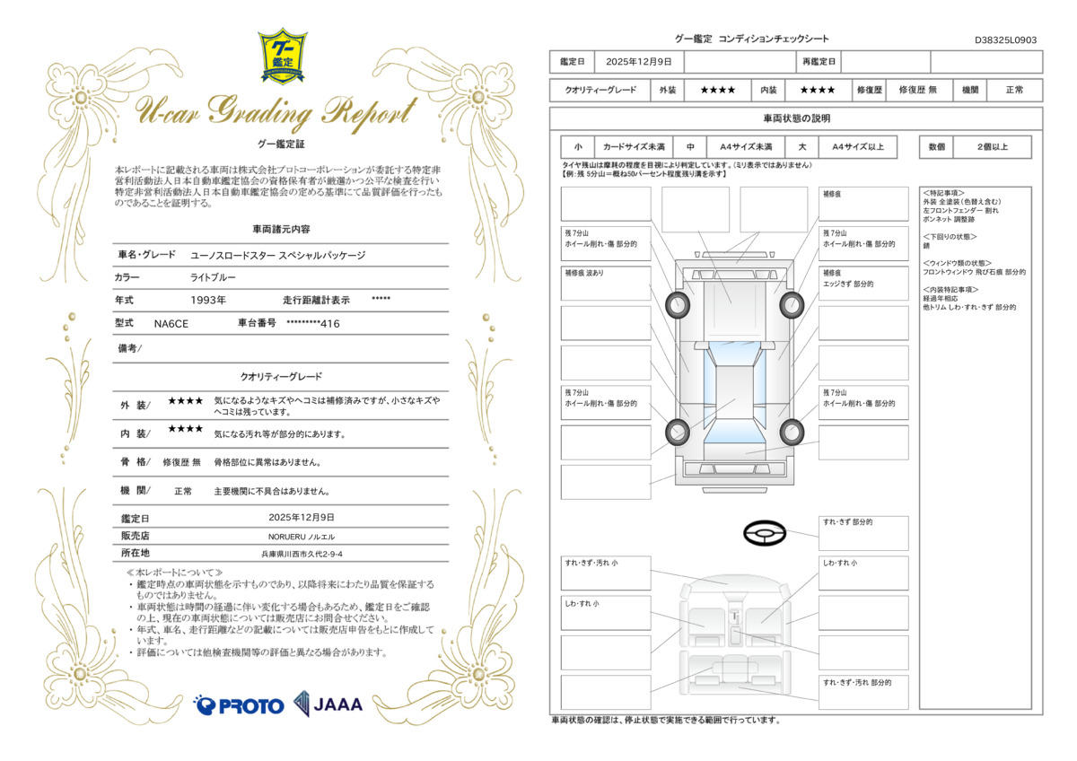 1第三者機関の日本自動車鑑定協会(JAAA)の鑑定師が中古車を鑑定。プロが一台一台チェックします。2外装・内装・機関・修復歴の4項目について鑑定を行っています。見た目からでは判断がつかない箇所も入念にチェックしています。3鑑定した外装、内装、機関、修復歴の鑑定証を発行。