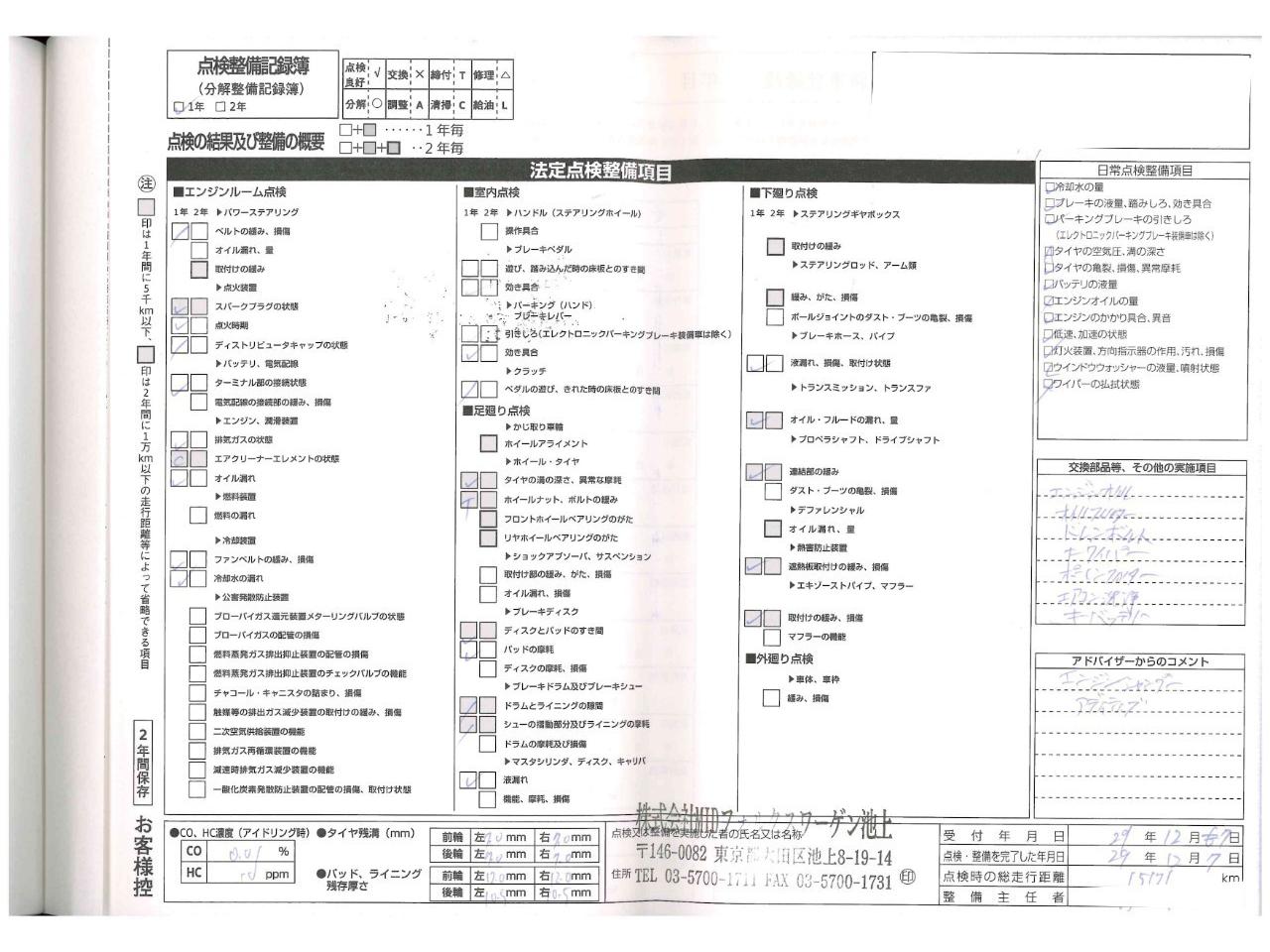 | エンジンオイル・エンジンオイルフィルター・バッテリー・ブレーキフルード・エアコンフィルター・フロントワイパーゴム・クーラントブースター・エアフィルター・エンジンインジェクタークリーナーを新品交換!!! |