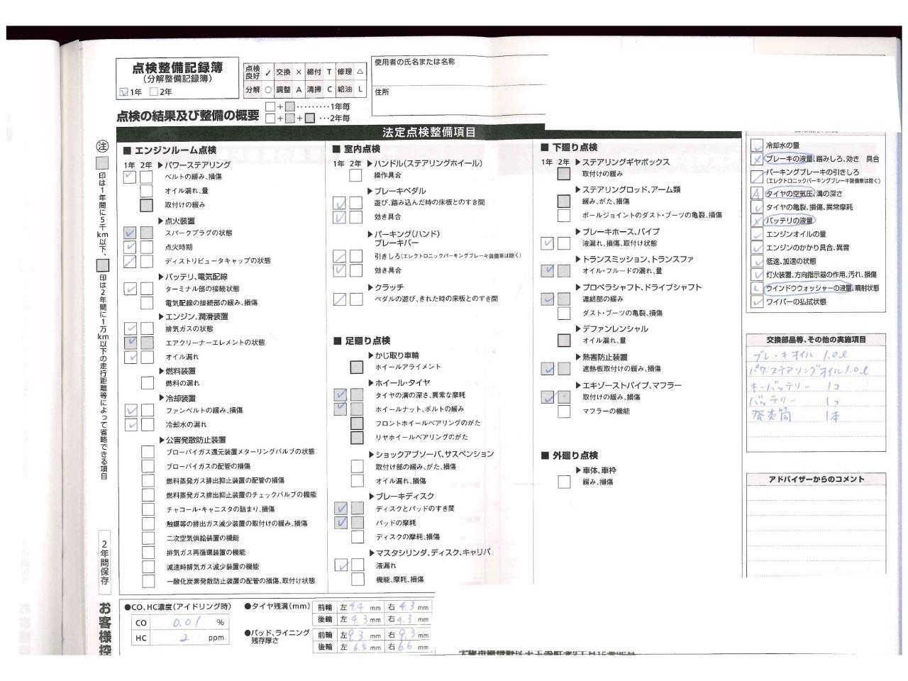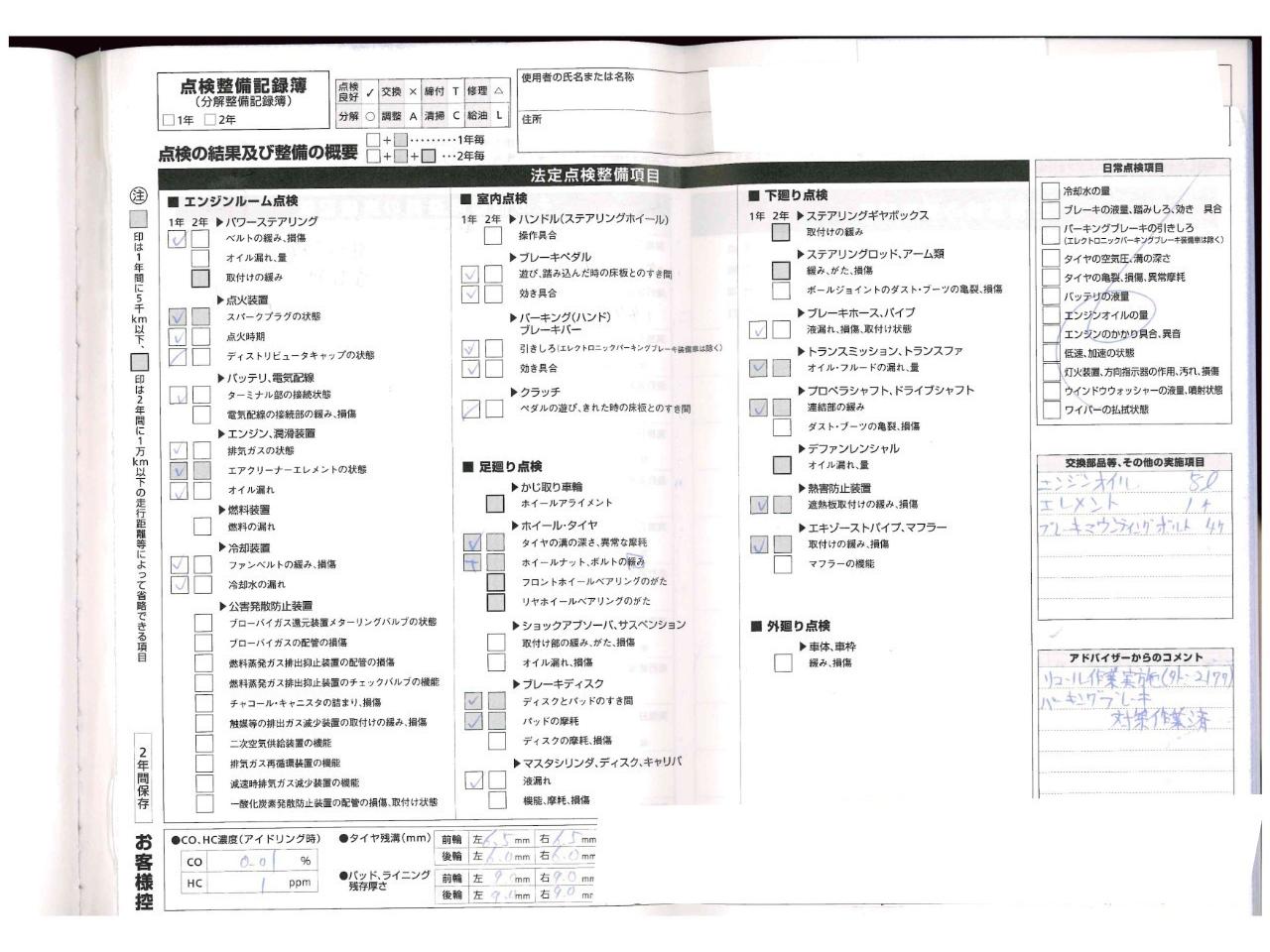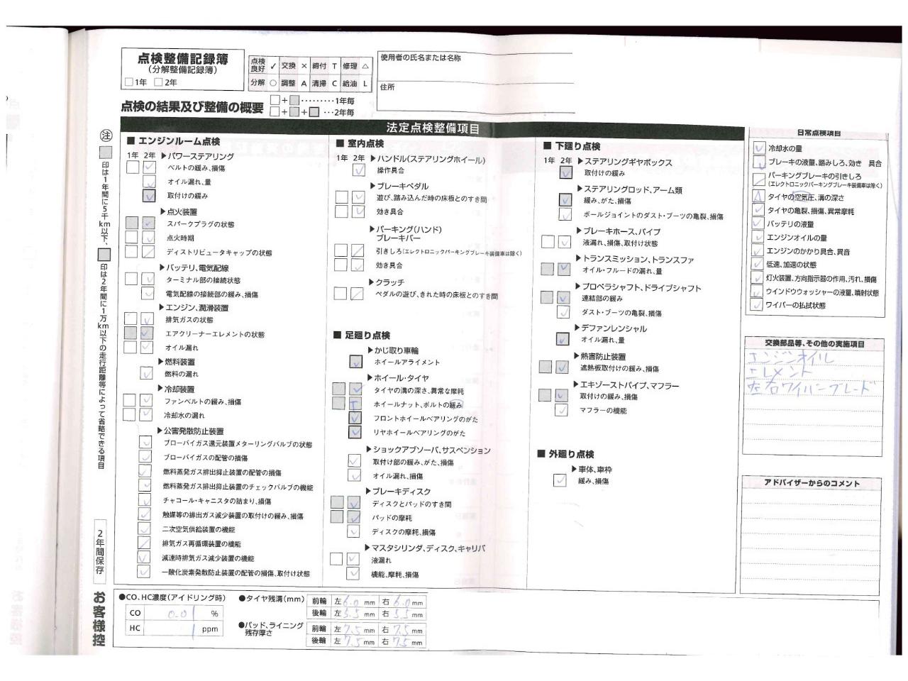 | エンジンオイル・エンジンオイルフィルター・バッテリー・ブレーキフルード・エアコンフィルター・フロントワイパーゴム・クーラントブースター・エアフィルター・エンジンインジェクタークリーナーを新品交換!!! |