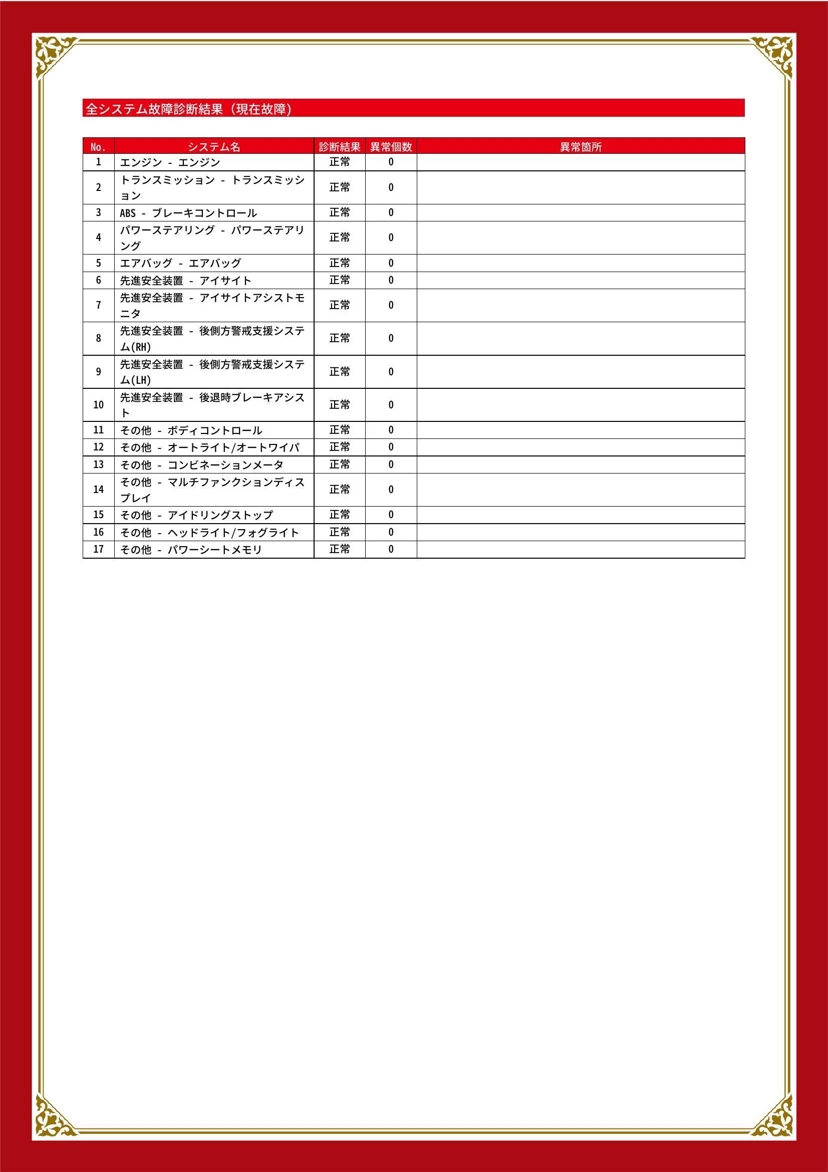 | 保証項目 | 3ヶ月・3000km以内ならエンジン、トランスミッション、ハイブリッド、ステアリング、ブレーキの各機構における主要項目を無償修理(または交換)いたします。 |