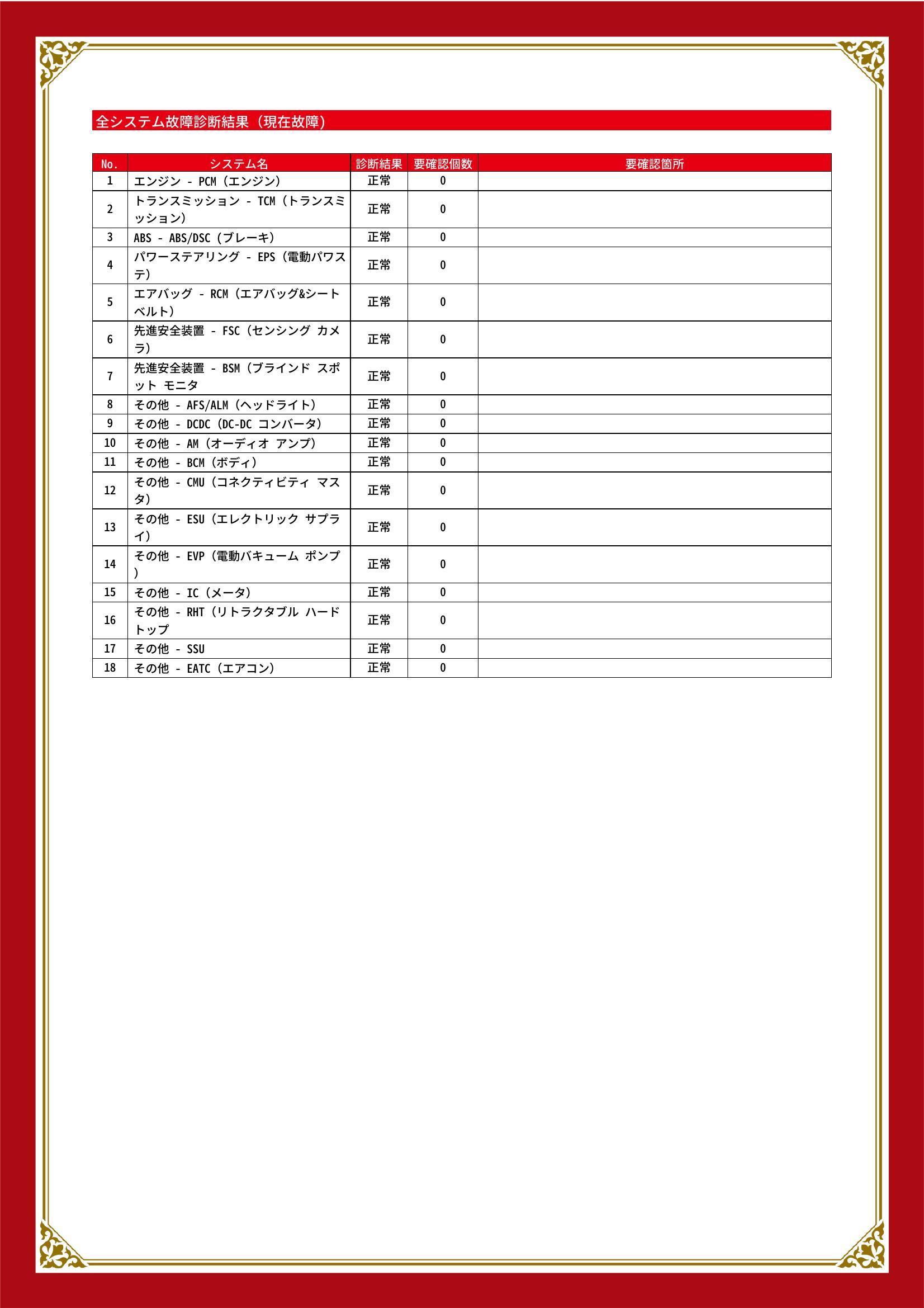 | 保証項目 | 3ヶ月・3000km以内ならエンジン、トランスミッション、ハイブリッド、ステアリング、ブレーキの各機構における主要項目を無償修理(または交換)いたします。 |