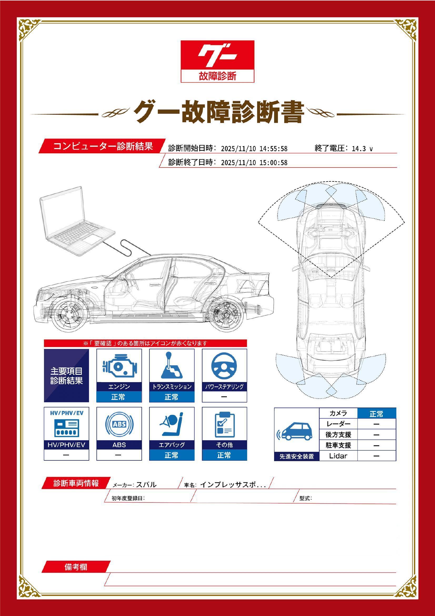 | 保証項目 | 3ヶ月・3000km以内ならエンジン、トランスミッション、ハイブリッド、ステアリング、ブレーキの各機構における主要項目を無償修理(または交換)いたします。 |