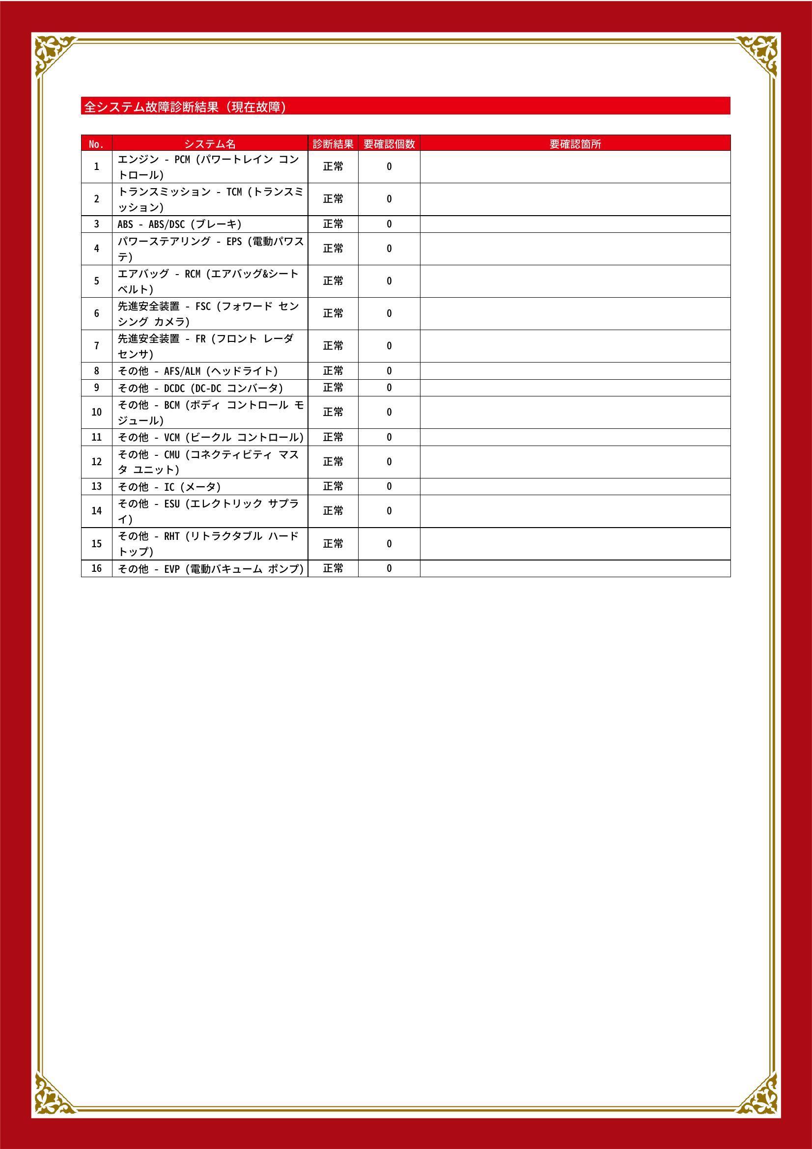 | 保証項目 | 納車後1ヶ月・1000km以内は36機構・343項目を保証いたします。詳しくは販売店までお問い合わせ下さい。 |
