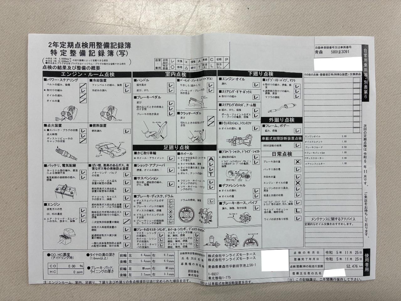 | 保証項目 | エンジン、ミッション、パワートレイン、ディファレンシャル、ステアリング、サスペンション、ブレーキ、経年・消耗部品(一部)、その他。無償修理(又は交換)にて対応致します。詳細はスタッフより説明致します。 |