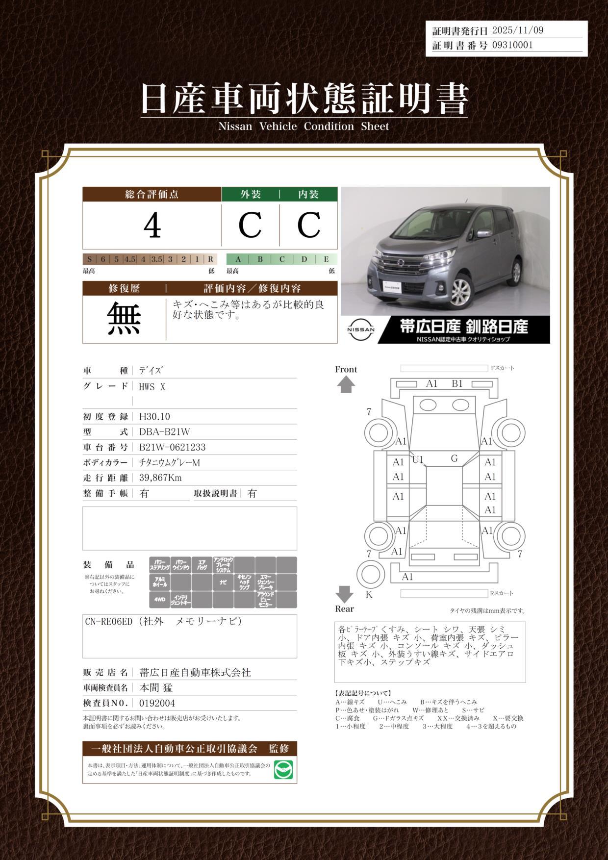 • また、修復歴・法定整備・保証の有無ならびに詳細内容につきましても、必ず各販売店にご確認いただきますようお願いいたします。