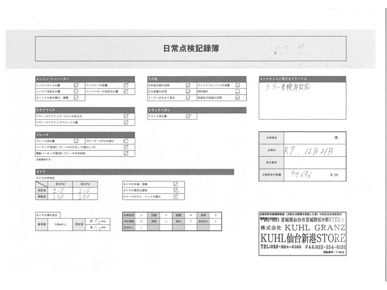 | 修理回数・上限金額 | KUHLオリジナル保証プランもご用意しております。車種、年式、走行距離に合わせた安心の保証プランを1年or2年からお選びいただけます。大切な愛車を長く楽しむ為に、是非ご検討ください。 |