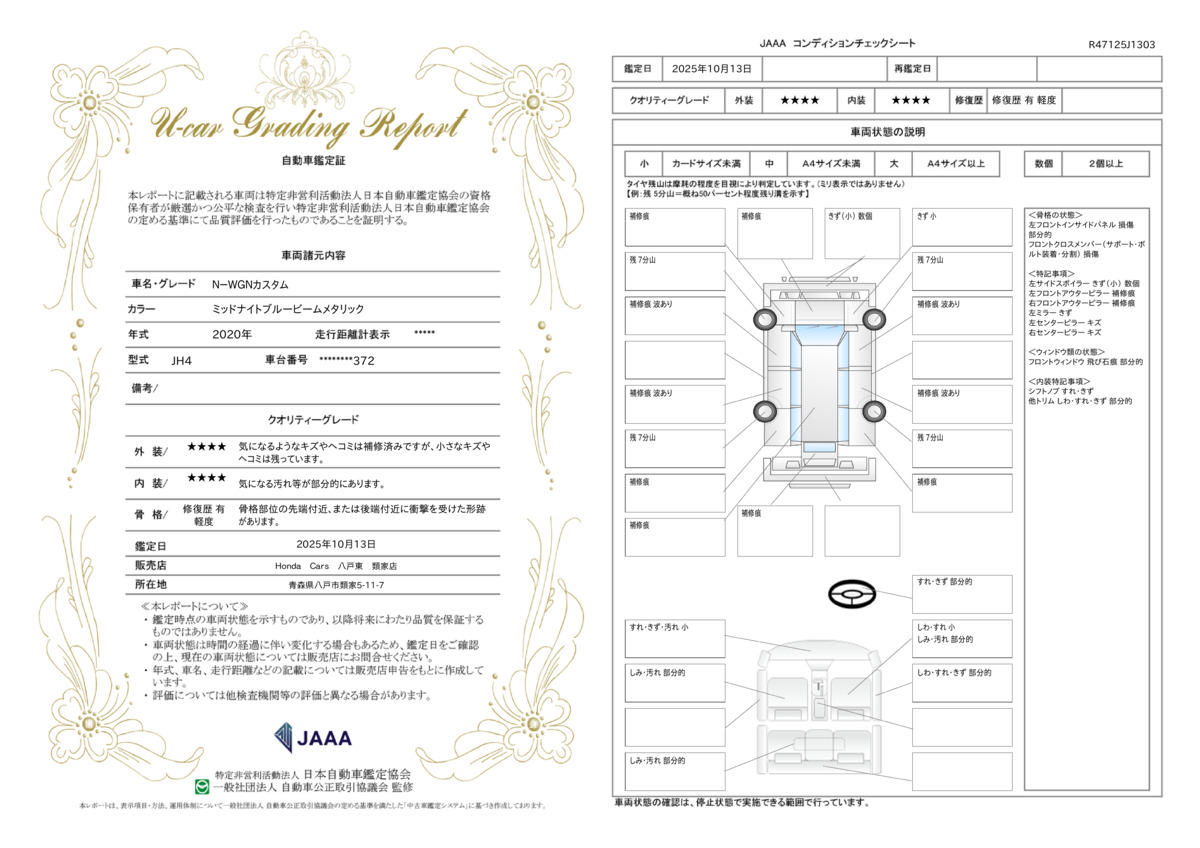 ※実際にお渡しするコンディションチェックシートにつきましては、形式および表示項目が異なる場合がございます。