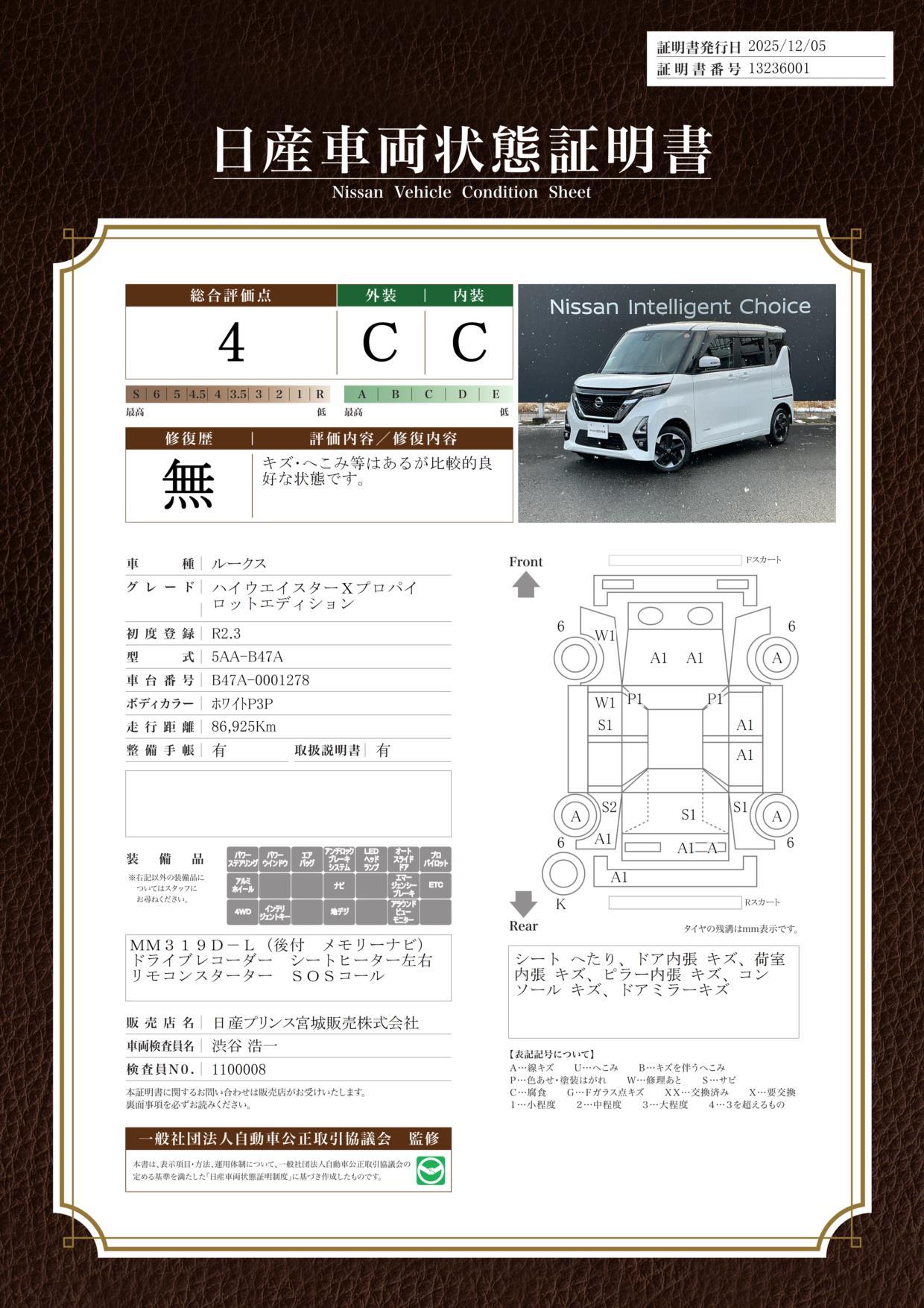 1年保証付(期間中走行距離無制限)全国の日産サービス工場にて保証が受けられるのでお出かけ時でも安心です♪2年延長保証もあります!『ワイド保証プレミアム』詳しくはスタッフまでお問い合わせください!
