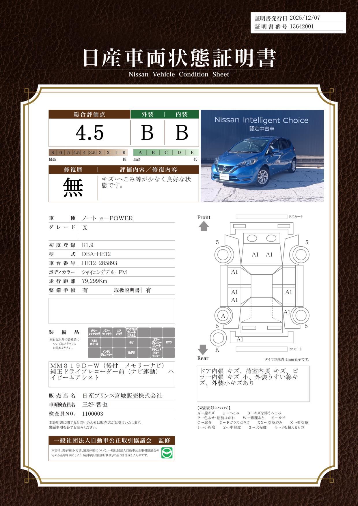 日産 ノート 1.2 e−POWER X 日産純正メモリーナビ・アラウンドビューモニター・スマートルームミラー・純正フロントドラレコダー・ETC・車線逸脱警報・横滑り防止装置・インテリジェントキー・エマージェンシーブレーキ・踏み間違い防止