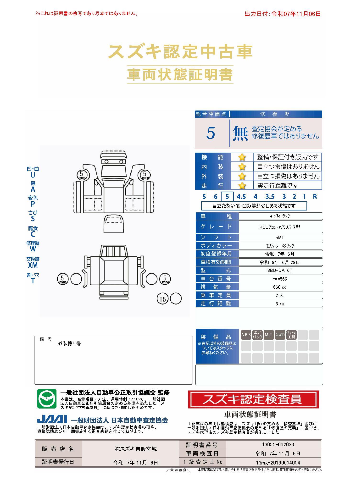 | 保証について | [保証付]:2028(令和10)年6月まで・60000km ※いずれか早い時期が保証適用の条件となります。 |