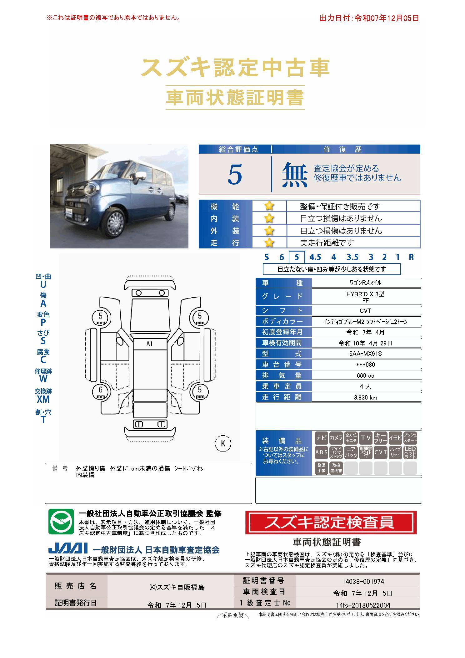 新車登録から60ヶ月以内のお車で、内外装良質な一台にお付けする36ヶ月・走行距離無制限の保証になります。もちろん点検を行い整備を完了してご納車いたします。※ スズキプレミアム認定中古車のお取り扱いには一定の条件がございます。詳しくは販売会社スタッフまで。