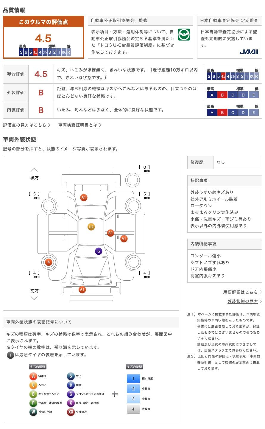 | 保証項目 | 計60項目 1年間走行距離無制限のロングラン保証付!僅かな費用で保証期間の延長が可能!最大で3年間まで保証の延長が可能!約60項目5000部品が保証対象です!もちろん全国のトヨタディーラーで保証が受けられます! |