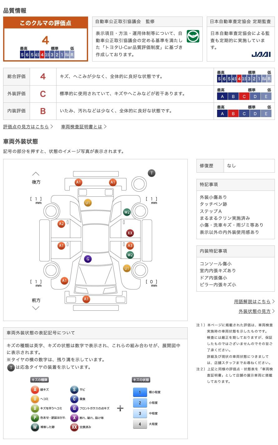 店頭にて、クルマの状態が一目で分かる検査証明書を公開中。トヨタ認定検査員が厳しく査定し、状態を点数と図解で表示しています。修復歴はもちろん、傷やヘコミの箇所や程度がご確認いただけます。 2