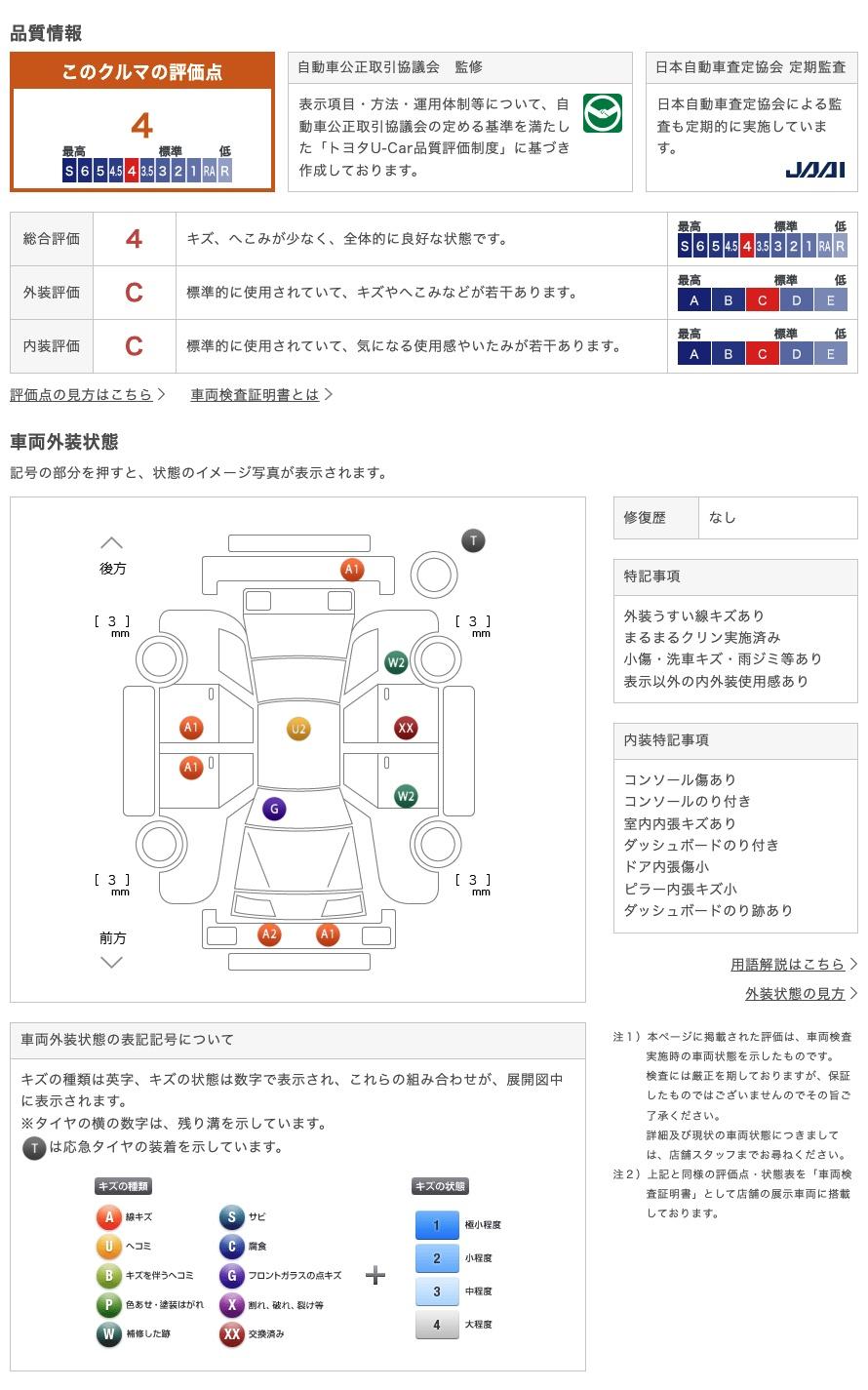 | 保証について | [保証付]:12ヶ月・走行無制限 1年間走行距離無制限のロングラン保証付!!全国5000店舗のトヨタ販売店にて保証修理可能です。別途有料にて最長3年までの保証延長が可能となります。 |