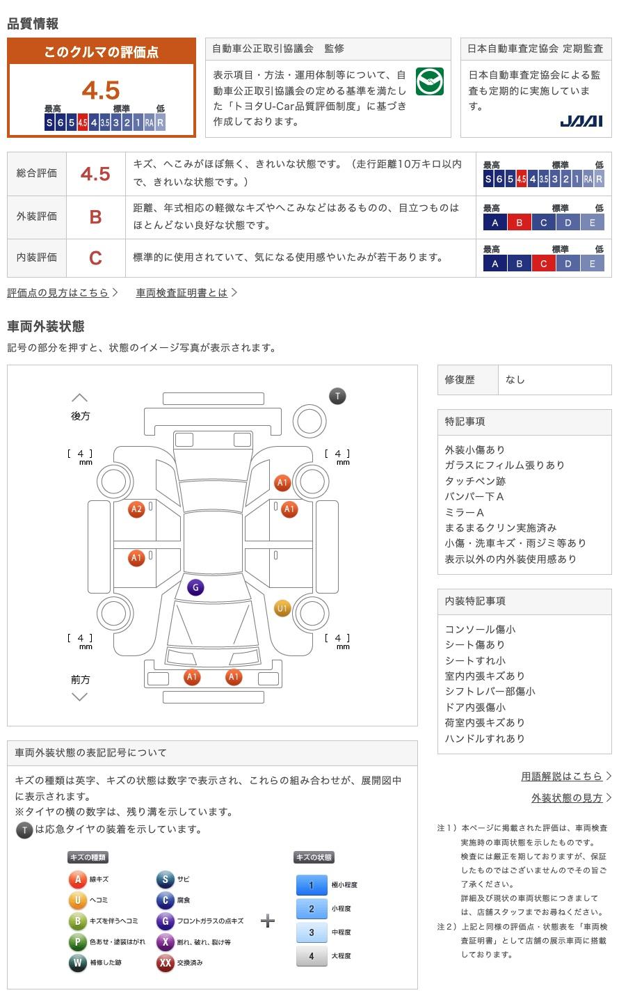 店頭にて、クルマの状態が一目で分かる検査証明書を公開中。トヨタ認定検査員が厳しく査定し、状態を点数と図解で表示しています。修復歴はもちろん、傷やヘコミの箇所や程度がご確認いただけます。 2