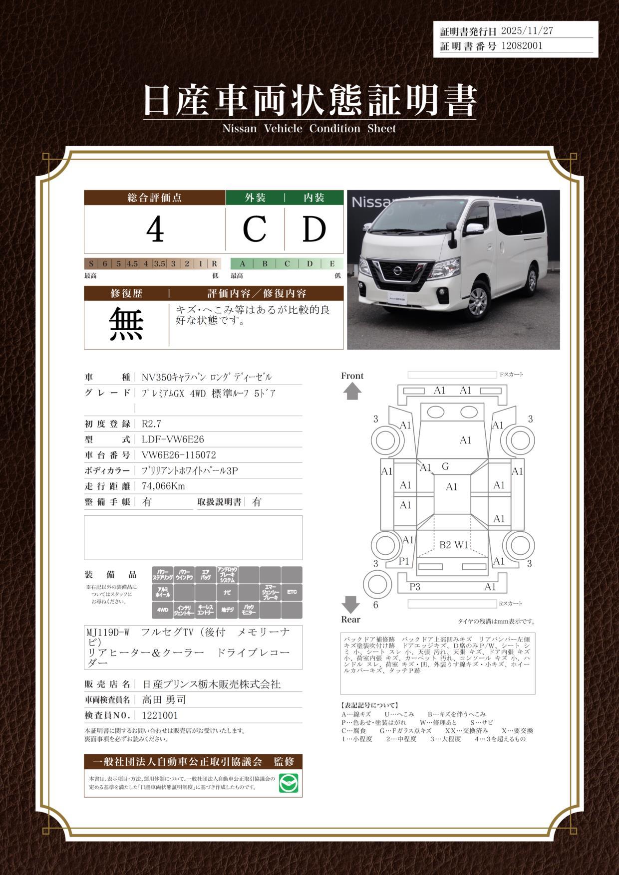 日産 NV350キャラバンバン ロングプレミアムGXターボ ディーゼル 4WD 1.0t 標準ルーフ 2/5人乗 5ドア 純正メモリーナビ フルセグTV Bカメラ エマブレ パワステ パワーウインドウ エアコン リアヒーター リアクーラー インテリキー ドラレコ ETC