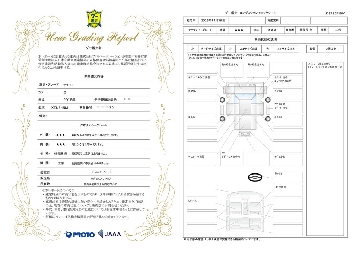 納車日から1ヶ月間または1,000キロのいずれか早い方の期間の保証がついています。架装部分は保証対象外となります。また業者販売の場合、保証は対象外となります。