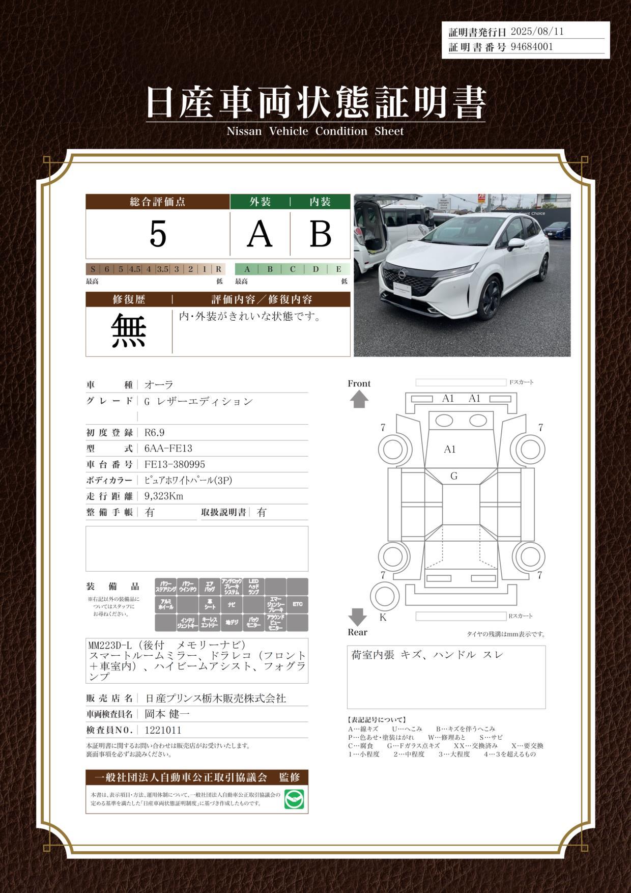 日産 オーラ 1.2 G レザーエディション メモリーナビ・フルセグTV・Bluetooth・ア 追突防止 本革 車線逸脱警報装置 LED ドライブレコーダー 盗難防止 バックモニター ETC インテリジェントキー メモリーナビゲーション AW キーレスエントリー オートエアコン 展示試乗車UP