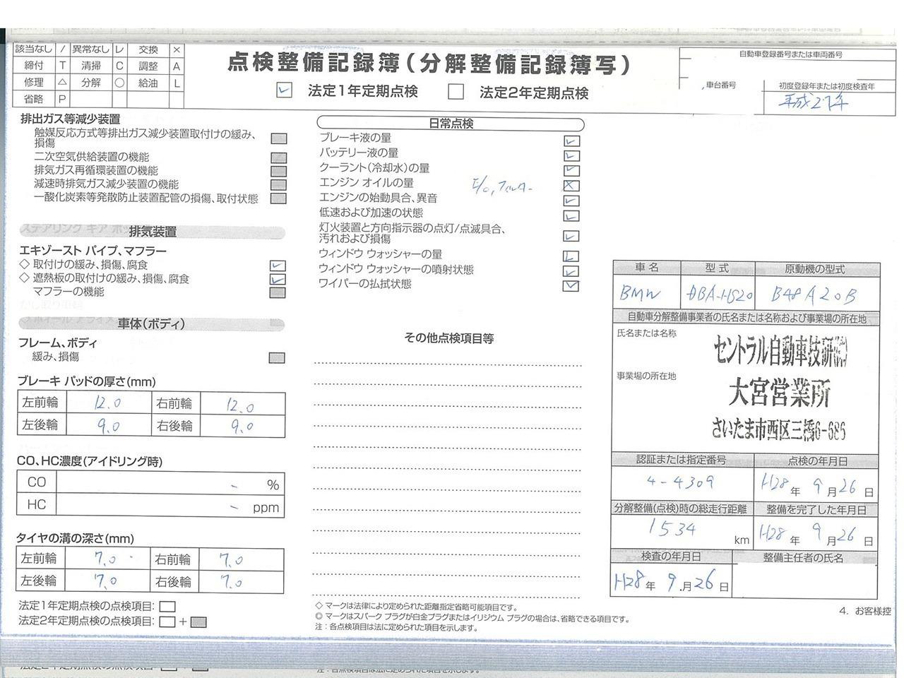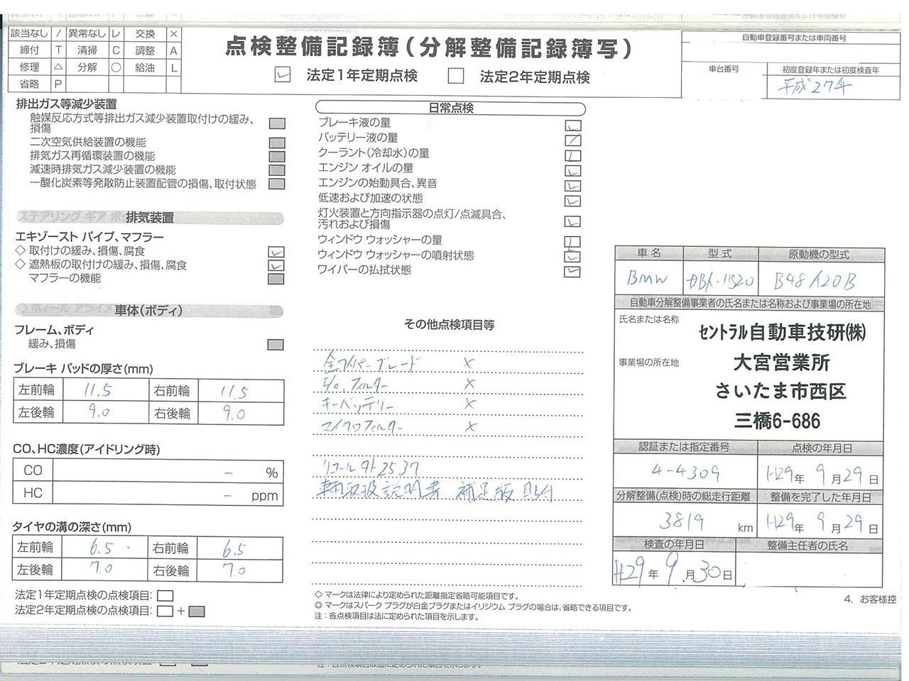 | 当社はBMWクオリティパートナー認定店です。ご納車前に認証工場にて点検致します。点検整備記録簿も発行致します。 |