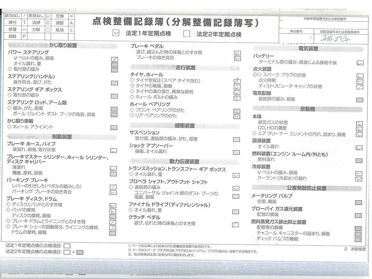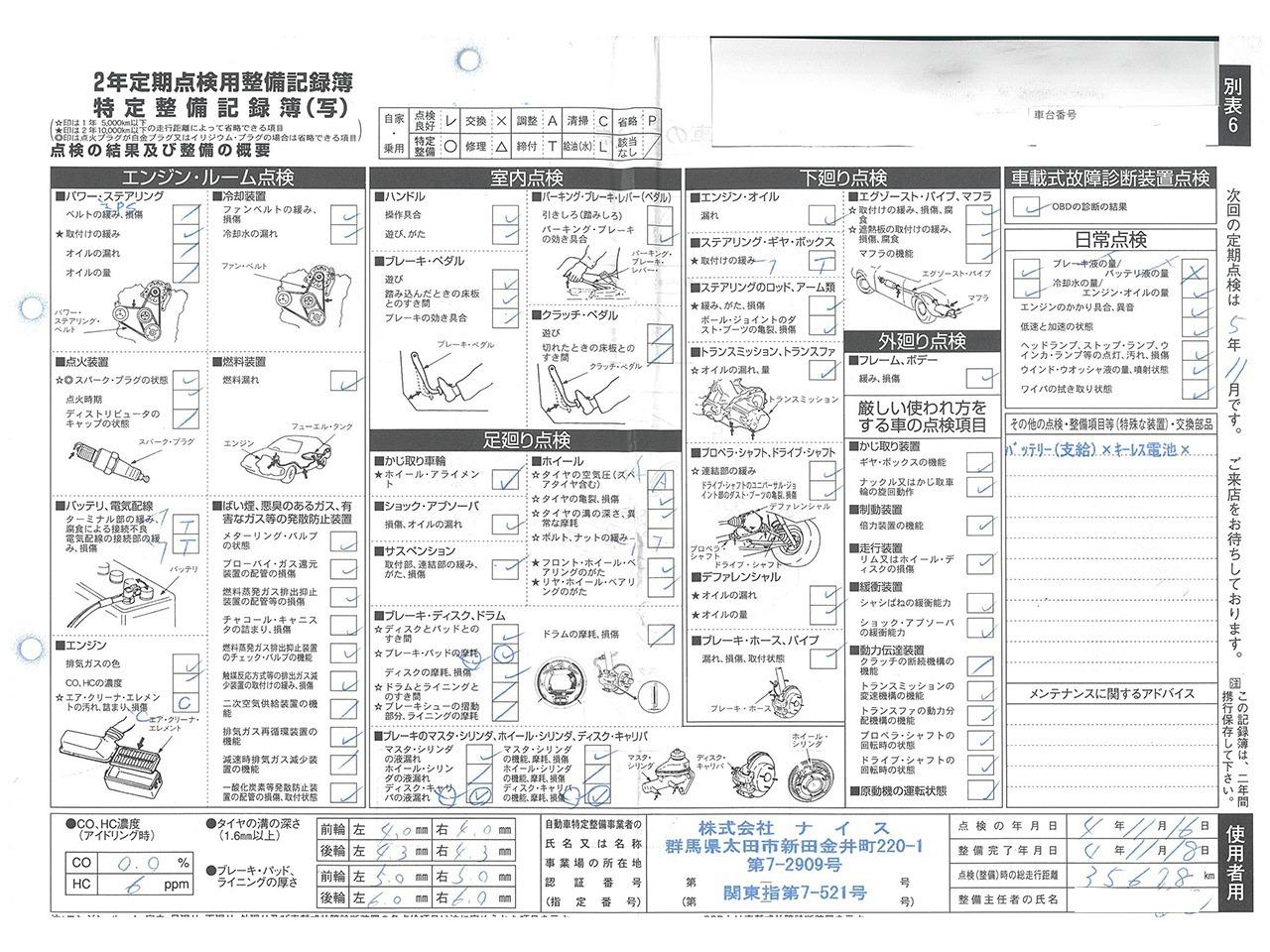 整備付 ご契約後からご納車までに認証工場にて法定点検を実施致します。点検費用は支払総額に含まれております。点検整備記録簿を発行致します。 |
