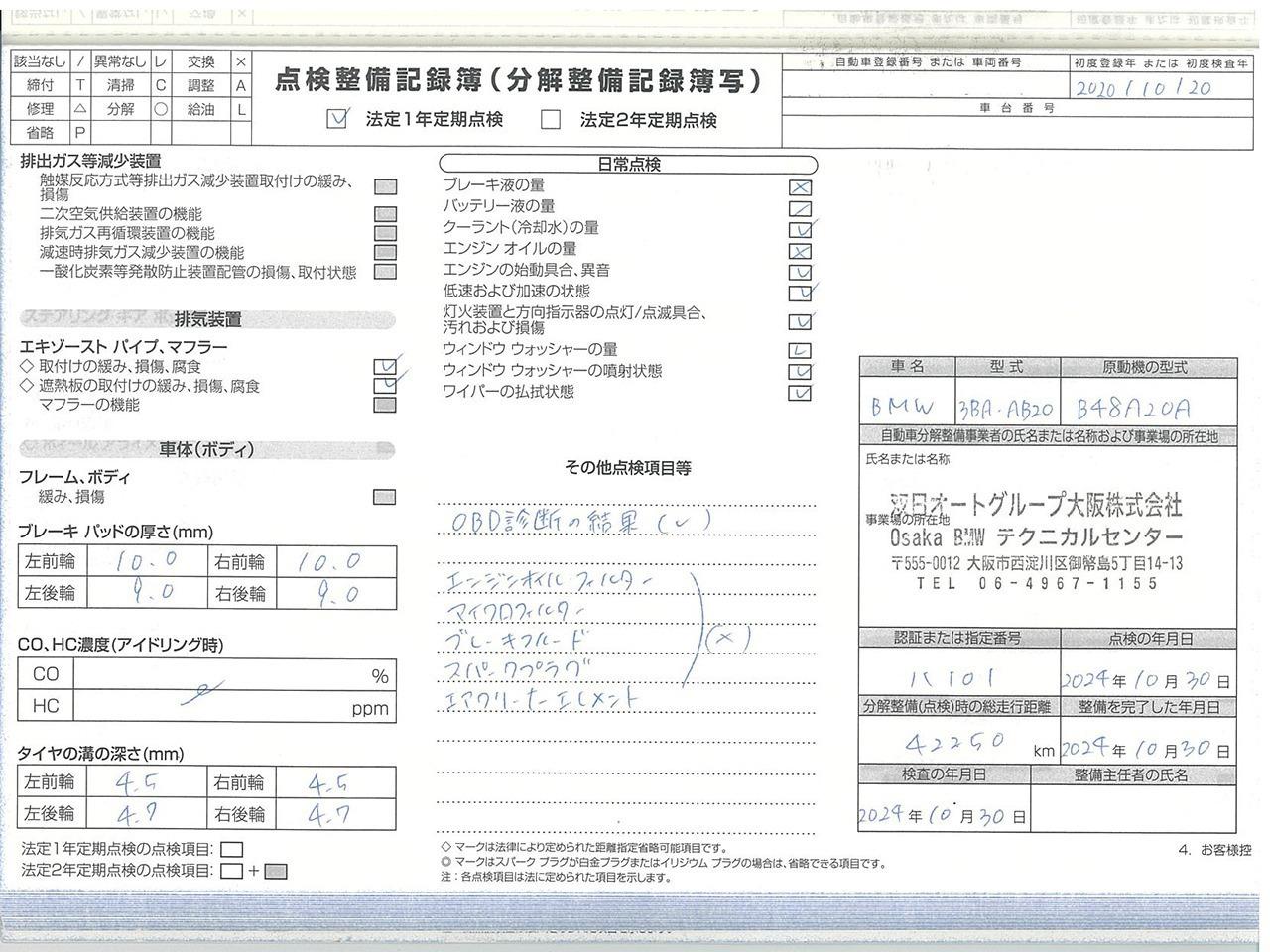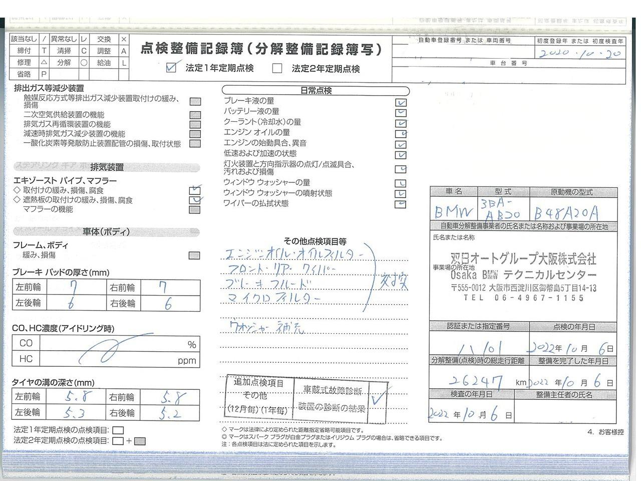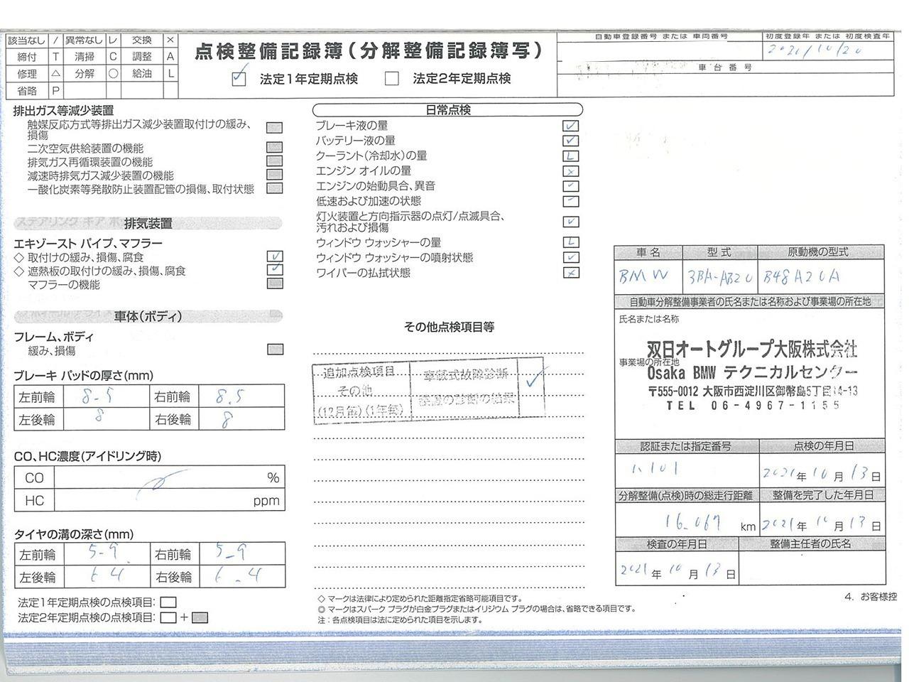 | 当社はBMWクオリティパートナー認定店です。ご納車前に認証工場にて点検致します。点検整備記録簿も発行致します。 |