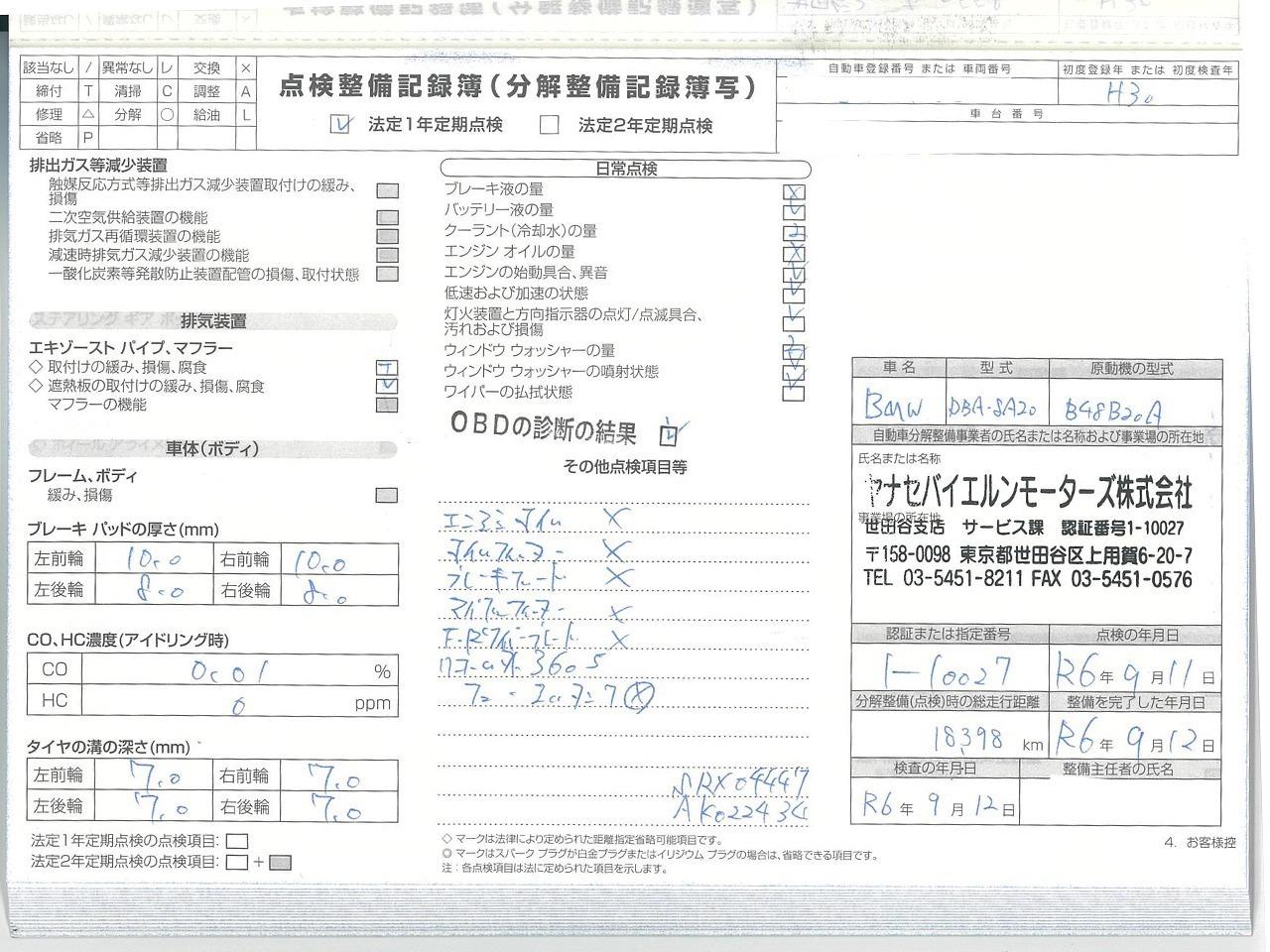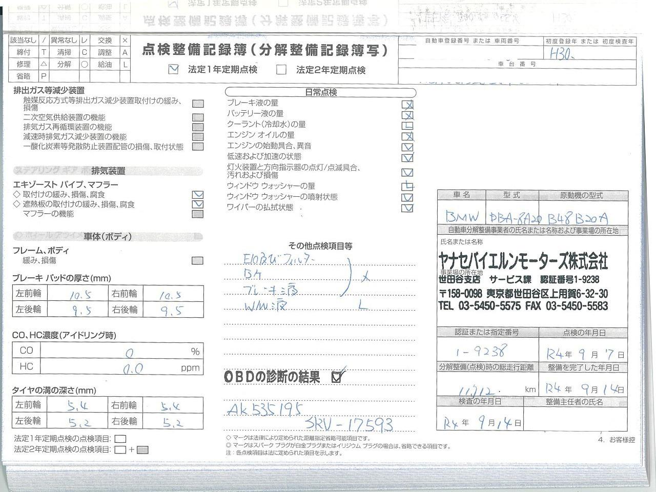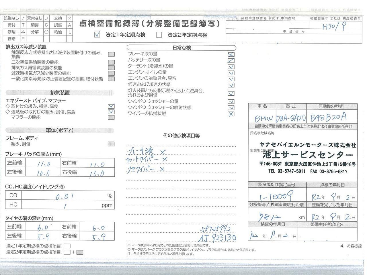 | 当社はBMWクオリティパートナー認定店です。ご納車前に認証工場にて点検致します。点検整備記録簿も発行致します。 |