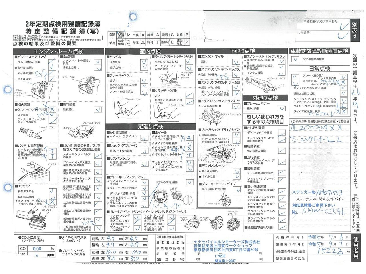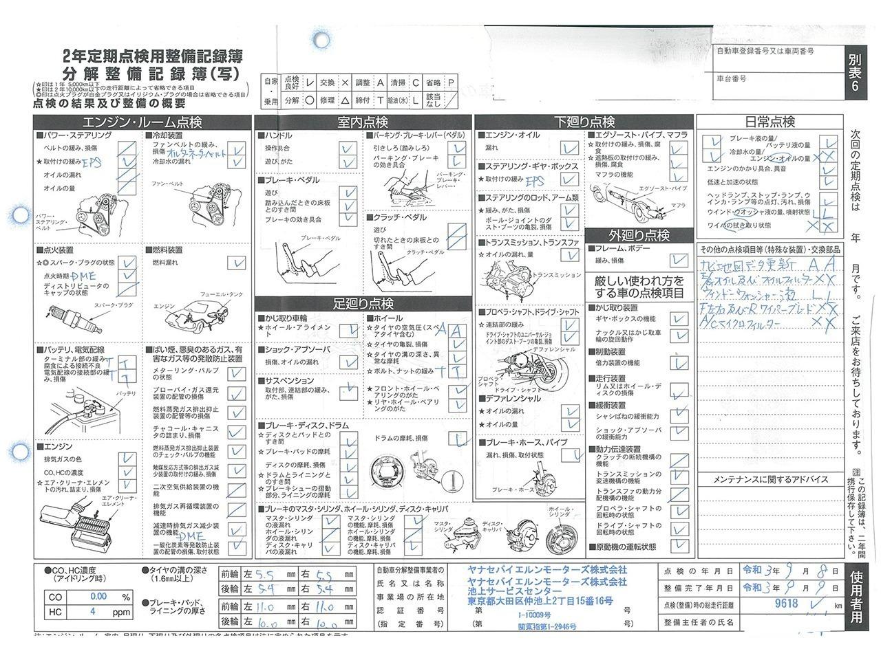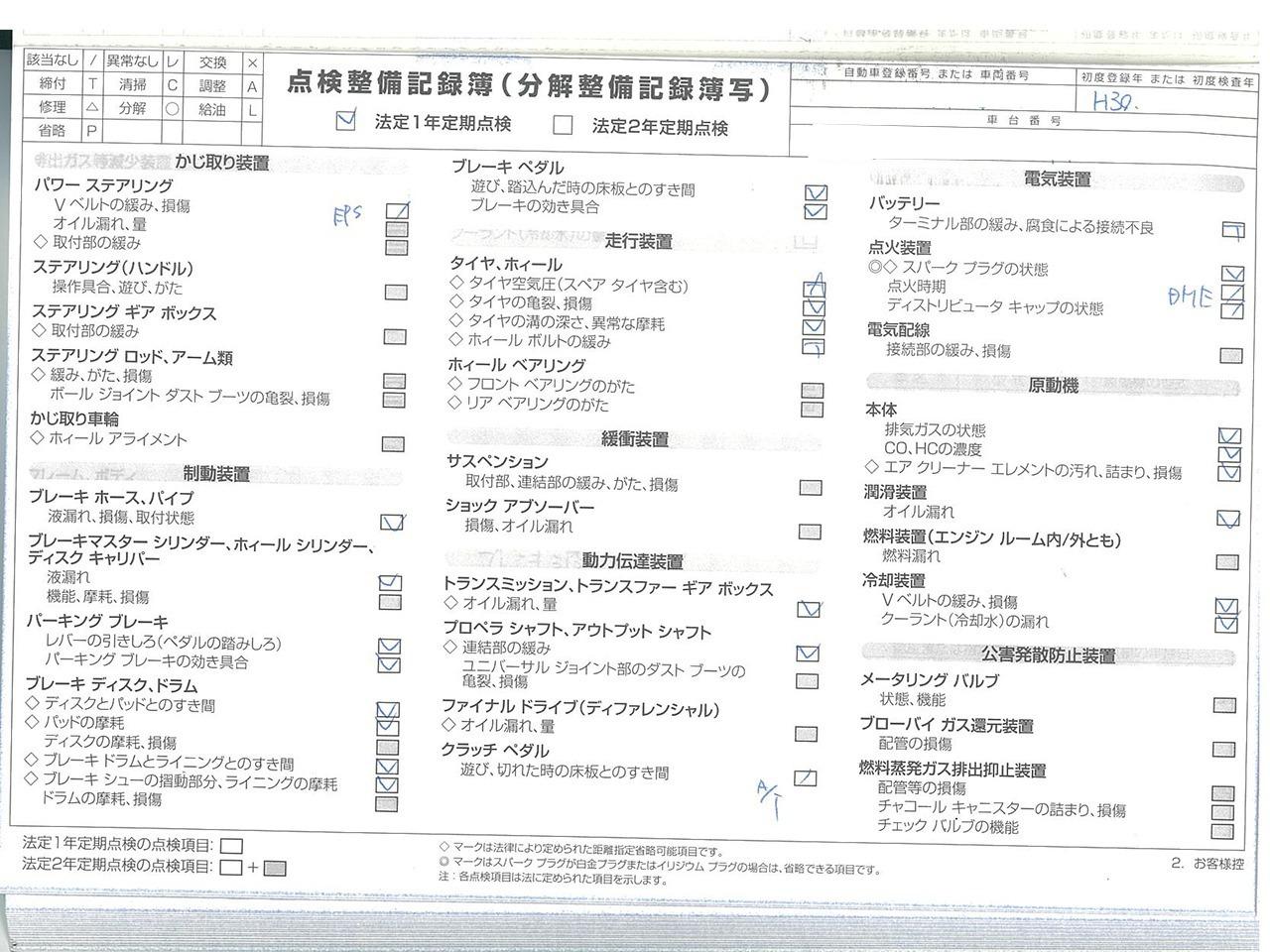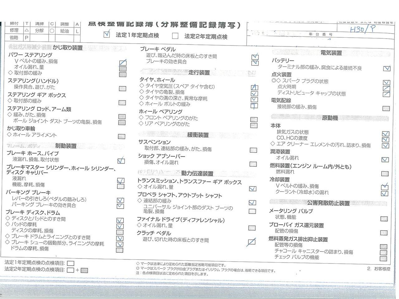 整備付 ご契約後からご納車までに認証工場にて法定点検を実施致します。点検費用は支払総額に含まれております。点検整備記録簿を発行致します。 |