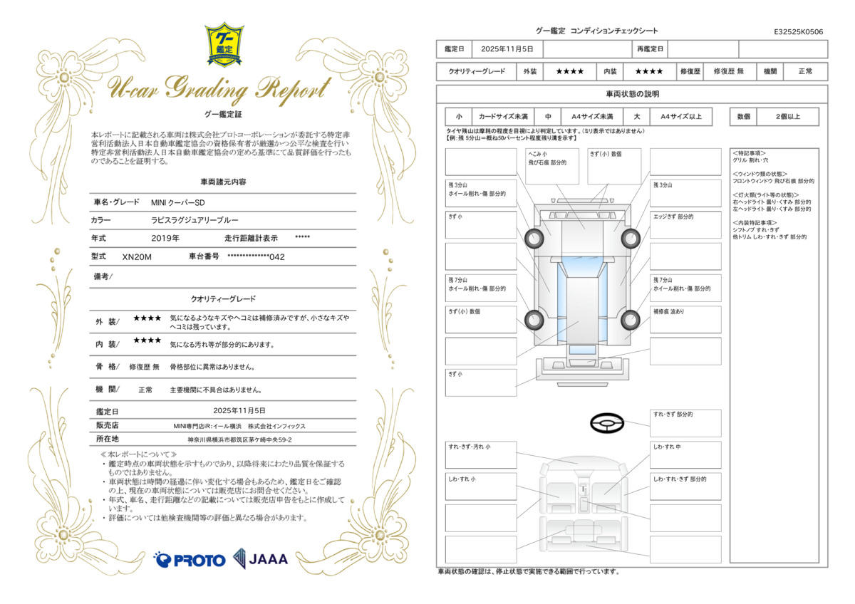 ■車輛評価書について・・・当社の物件は、基本、「修復暦なしの価値ある物件」のみを厳選して仕入れを行っておりますが、更なる安心感を添える為、「goo鑑定」にて品質評価を受けることができます。 15