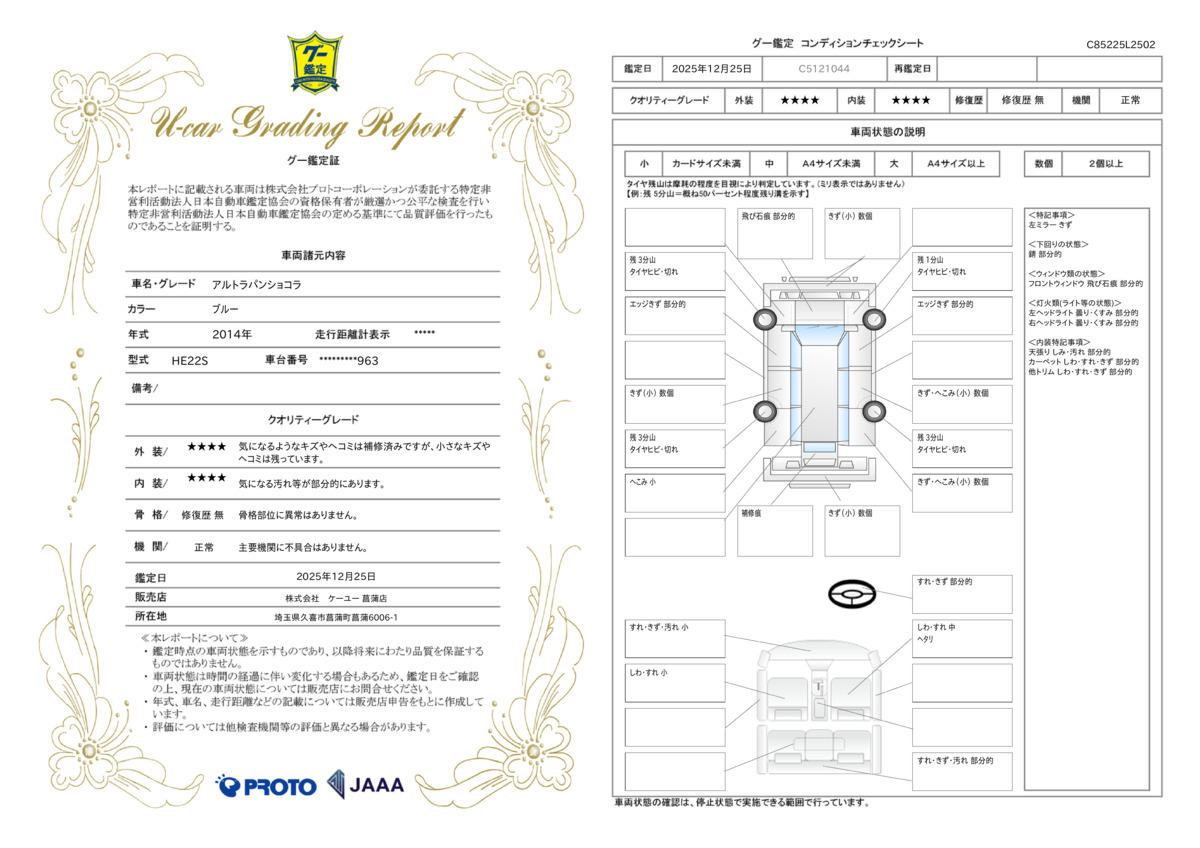 当展示車は全車両に”社団法人自動車公正取引協議会”の車両状態説明書を掲示しております。修復歴の有無はもちろん、ドア等の外板の交換歴の有無までも表示☆口頭説明ではなく書面にてお渡ししております♪ 15