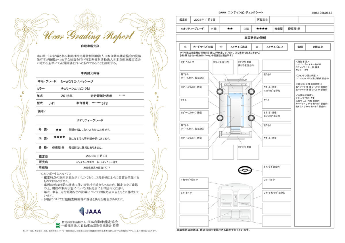 ホンダ N−WGN G・Aパッケージ この車両は未加修現状販売「そのまんま車」になります。傷や凹み・内装を現状にて展示しております。詳しくはスタッフにお問い合わせください。純正メモリーナビドラレコETCRカメラワンオーナー ETC付き