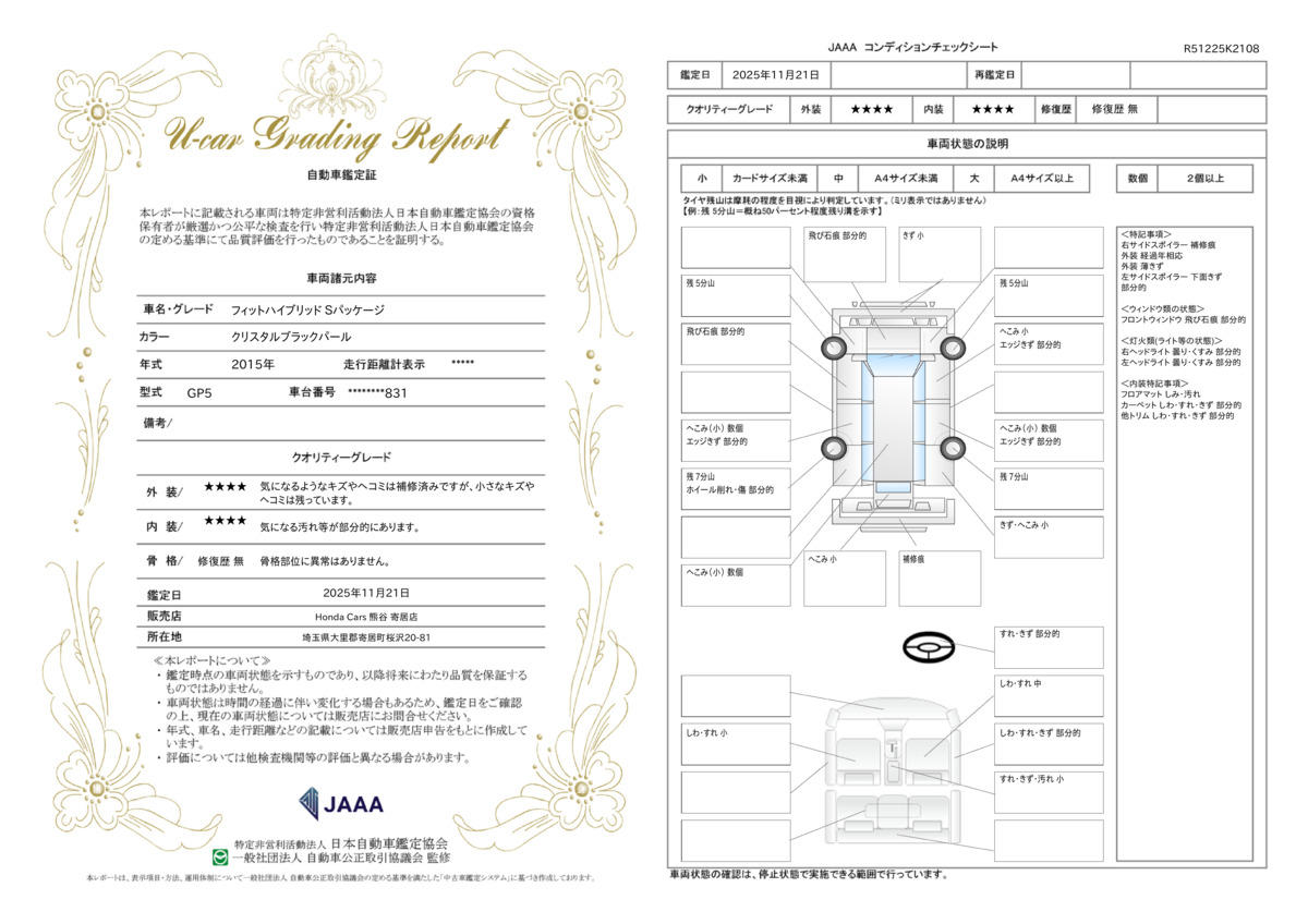 当社では第三者機関JAAAの鑑定士が内外装の評価・修復歴の有無・キズの状態や場所など細部に至るまで徹底チェックした鑑定書を発行しておりますので状態の確認含めて安心、信頼、満足にお応えします。 25