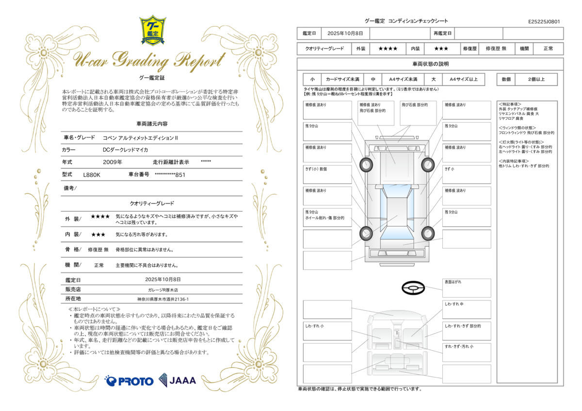 鑑定書は外装、内装の状態なども公開しています。メーター改ざん車両等は鑑定証は発行されません。一台一台が異なる一点物となります為、是非ご検討の際にはご確認ください。