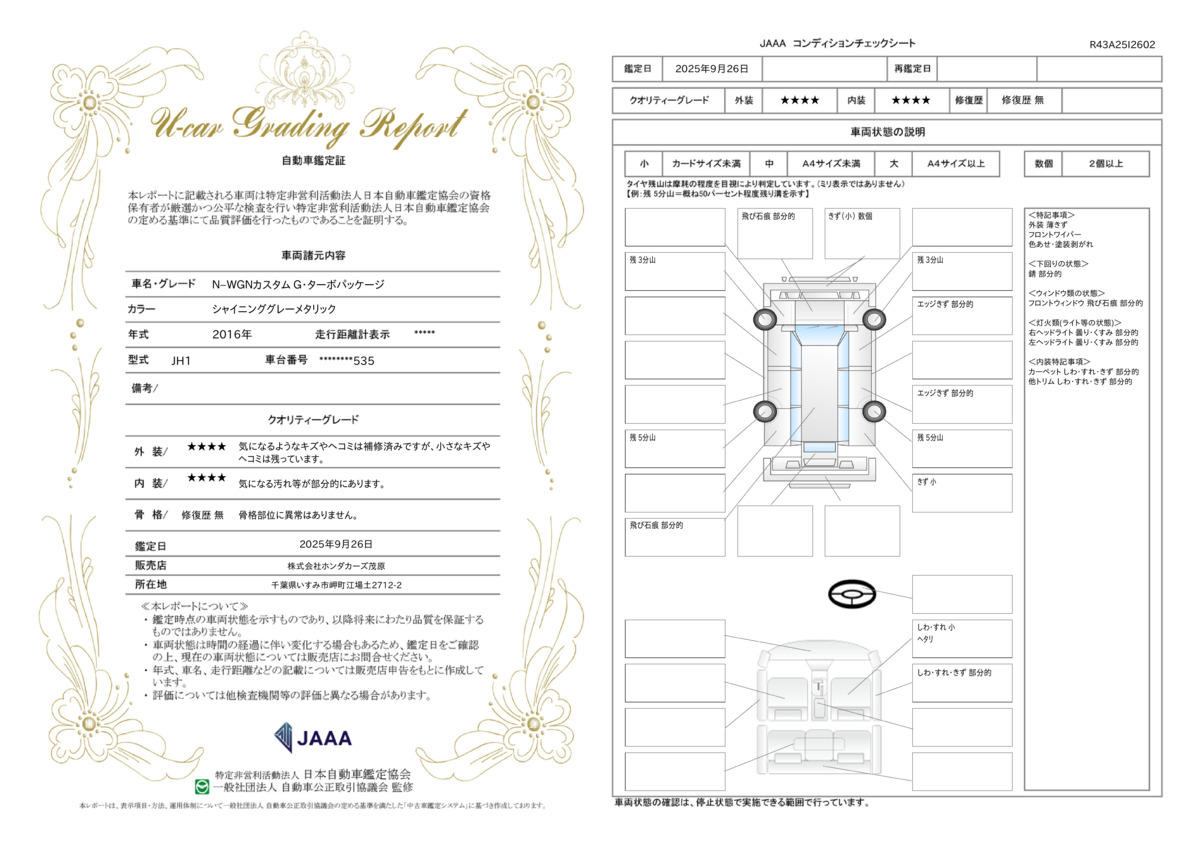 当社にて展示・販売する車両には日本鑑定協会発行(JAAA)の「鑑定書」が付いております。外装・内装は勿論、機関・骨組み(修復)・走行距離改ざんの有り無を厳しく鑑定し、その証明として鑑定書を発行しております。