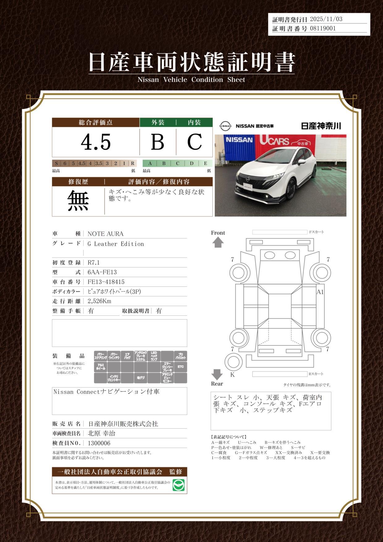 [保証付]:24ヶ月・走行無制限 【日産中古車ワイド保証1年】 ◎日産中古車ワイド保証は、保証期間の延長オプション《1年延長(=2年)/2年延長(=3年)》が可能です。成約後、日産プリンス神奈川自社整備工場にて、点検整備を行います。 |