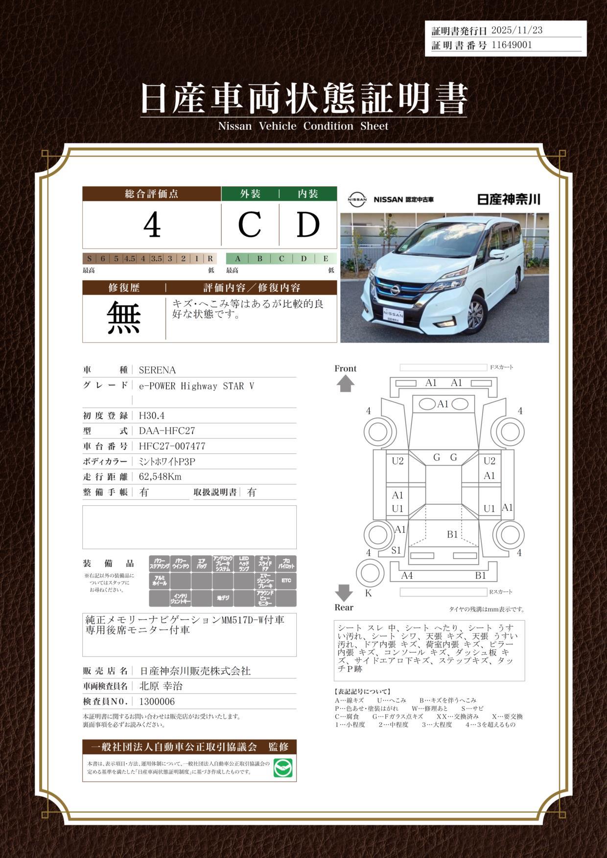 プレミアム認定中古車ならさらに安心走行距離無制限、大切な愛車のパーツ類を2年間無料保証!全国の日産サービス工場をご利用いただけるので、万が一お出掛け先でトラブルが発生しても安心です。(日産車以外もサポートいたします)また、1ヶ月又は1000km走行時に、無料点検を実施
