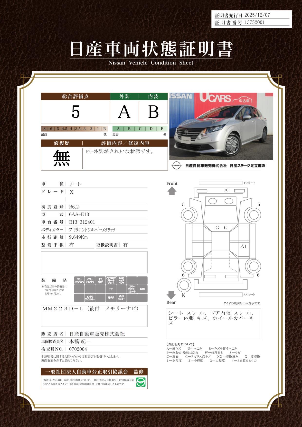 日産 ノート X 1.2 X ◇メモリーナビ(MM223D−L)◇バックモニター◇LEDライト◇ETC◇