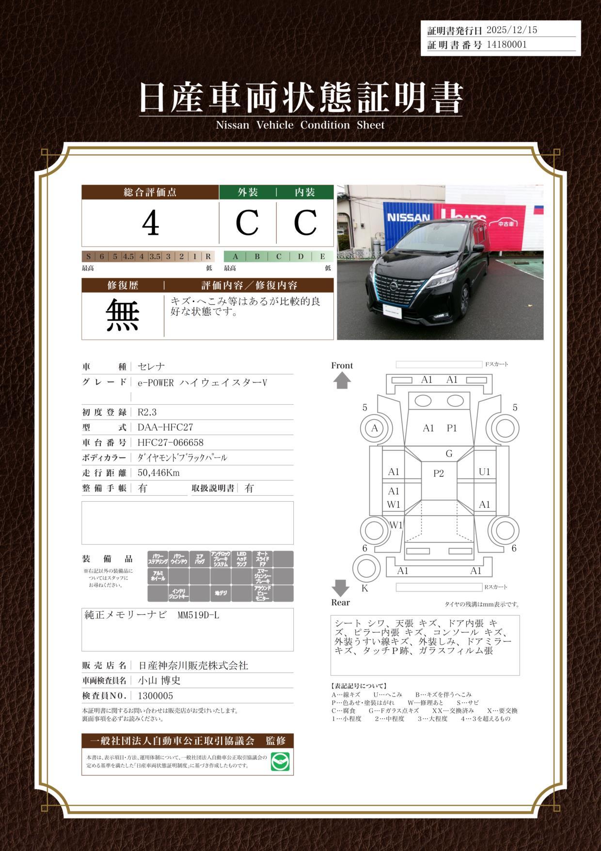 [保証付]:12ヶ月・走行無制限 【日産中古車ワイド保証1年】 ◎日産中古車ワイド保証は、保証期間の延長オプション《1年延長(=2年)/2年延長(=3年)》が可能です。成約後、日産プリンス神奈川自社整備工場にて、点検整備を行います。 |