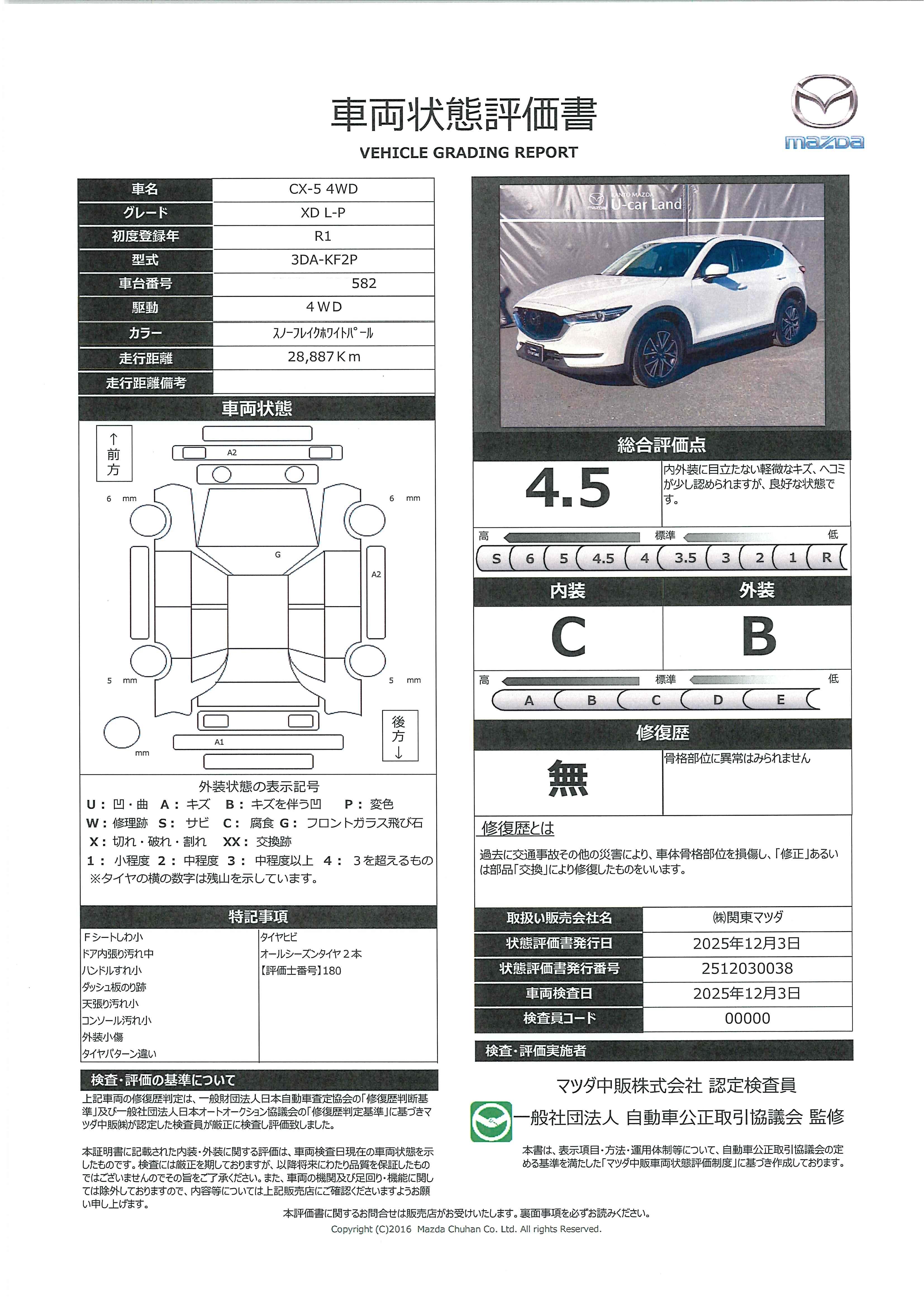・12ヶ月点検、又は、車検整備に相当する商品化整備を実施・納車後、1ヶ月後に無料点検整備を実施・全国のマツダディーラー共通のメンテナンスノートを発行・全国のマツダサービス網による万全のサポート体制※マツダ車のみ適用 ※保証内容詳細はスタッフにお問い合わせください。
