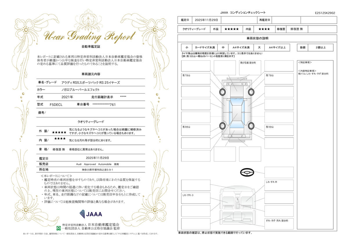 | 保証項目 | 初年登録3年以上の車両に1年間のAAA保証を付帯します。またAudi認定中古車全てのグレードで延長保証1年または2年に有償にてご加入頂けます |