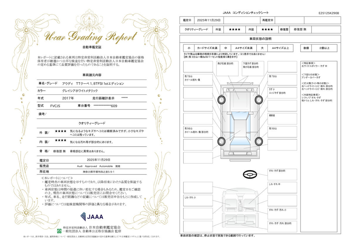 | 保証項目 | 初年登録3年以上の車両に1年間のAAA保証を付帯します。またAudi認定中古車全てのグレードで延長保証1年または2年に有償にてご加入頂けます |