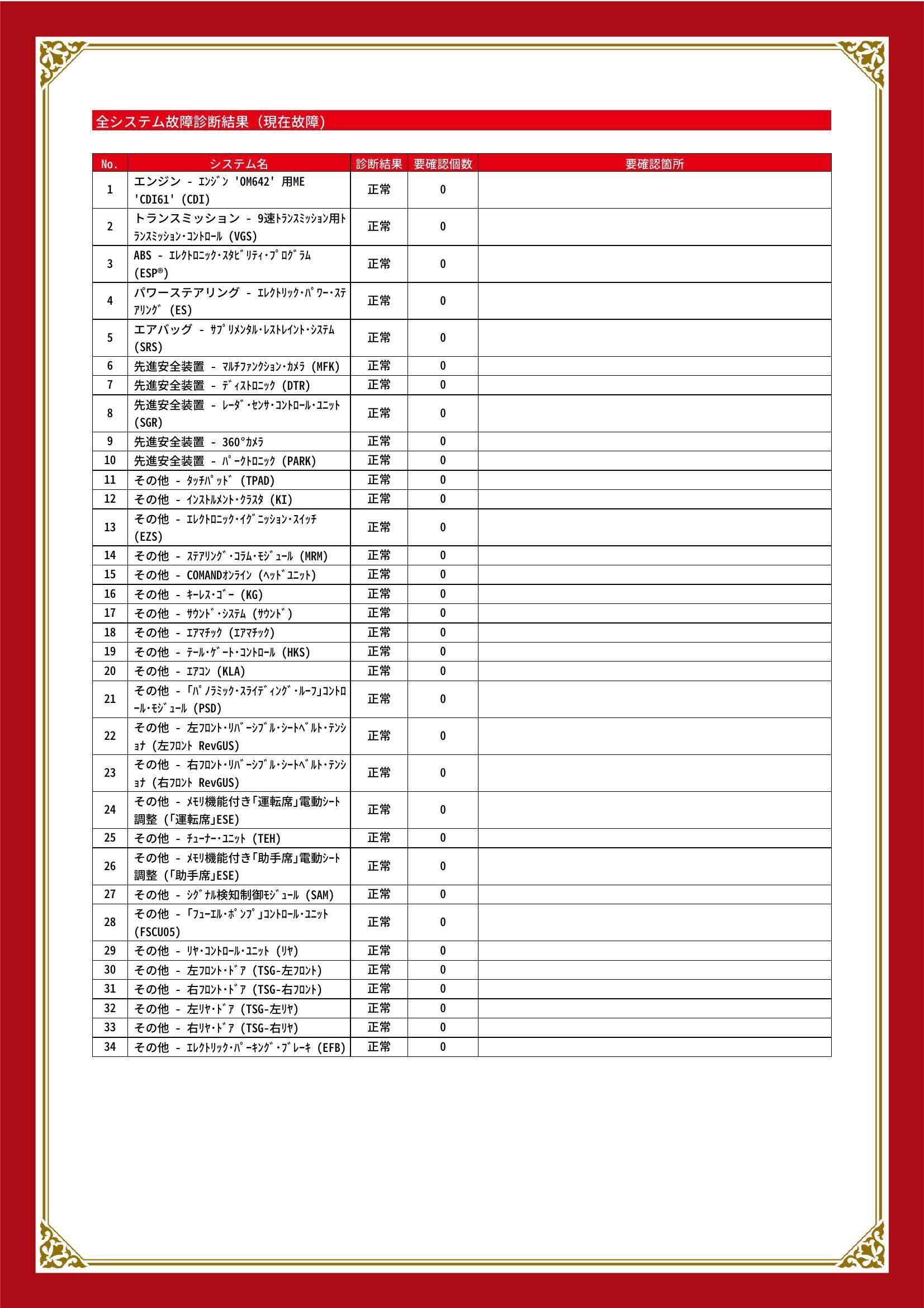 | 保証項目 | 1ヶ月以内なら走行距離無制限にてエンジン、トランスミッション、ハイブリッド、ステアリング、ブレーキの各機構における主要項目を無償修理(または交換)いたします。 |