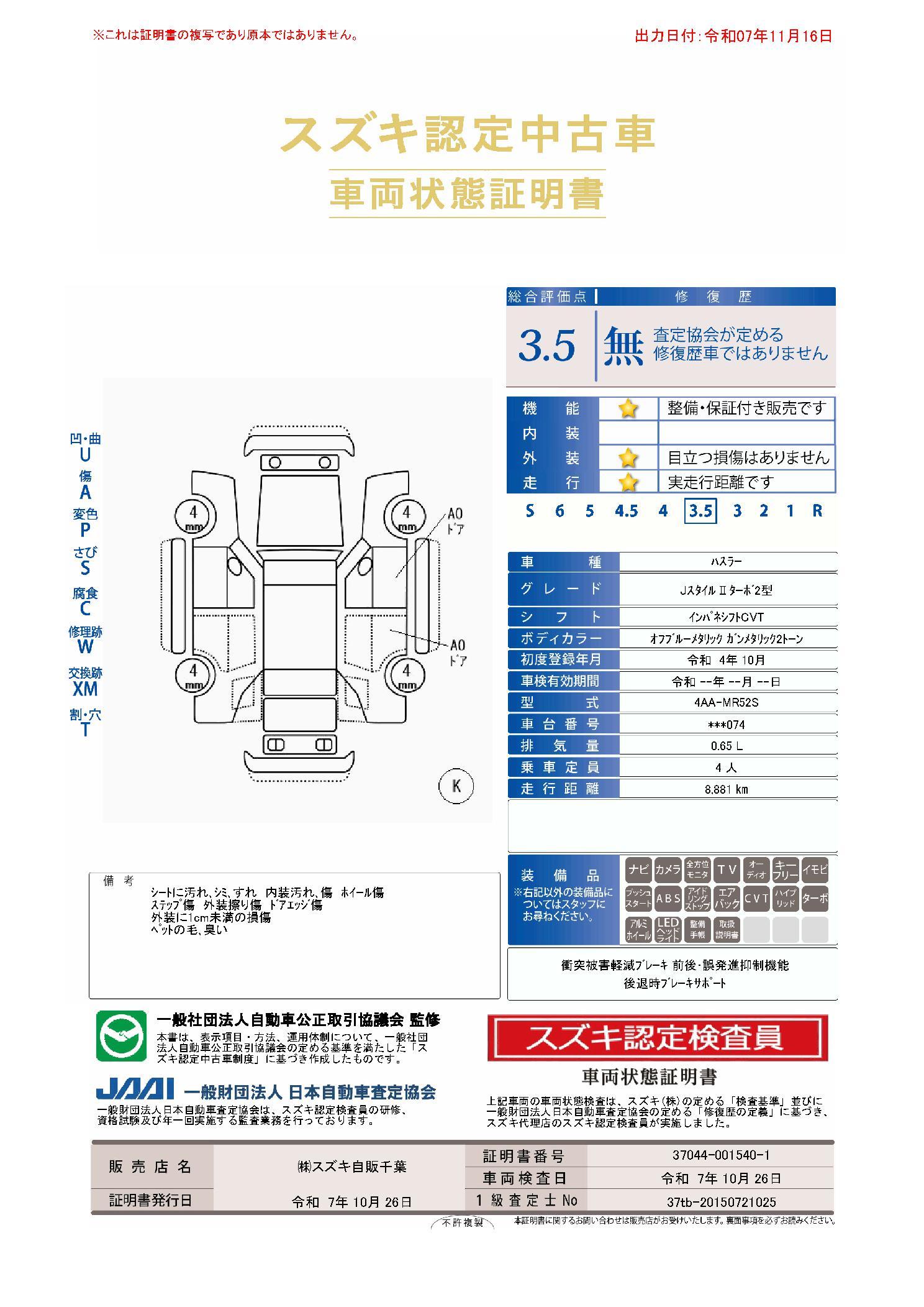 内装、外装、修復歴の有無などを細かくチェック、車両に痛みや凹みなどがある場合は記号と数字で表記し、車両の総合評価点を10段階で表記した車両状態証明書を発行しています。 55