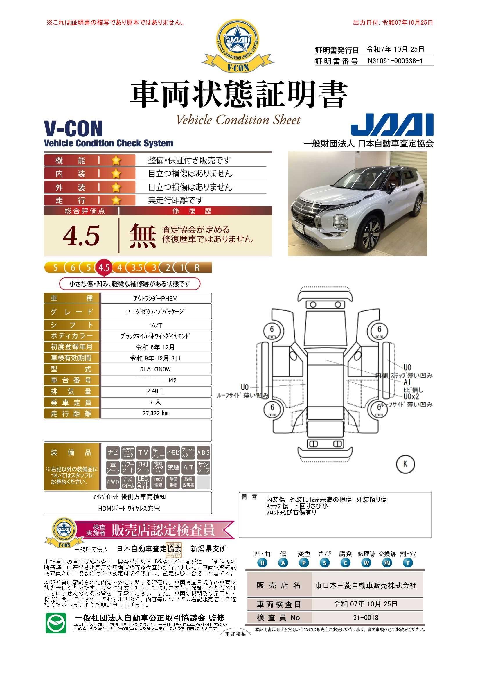 | 保証について | [保証付]:5年・走行無制限 走行距離無制限の三菱認定中古車保証を、2年延長するプランです!安心・快適なカーライフをサポートします。 |