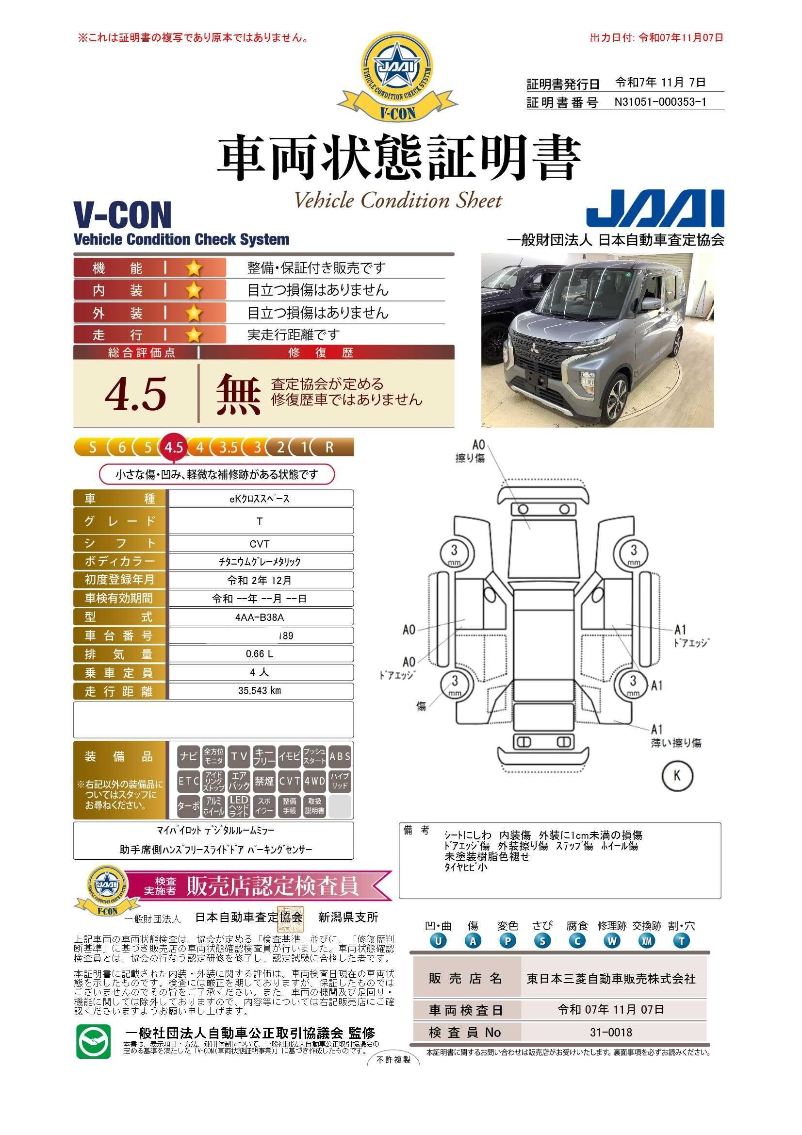 三菱 eKクロススペース T ワンオーナー 禁煙車 マイパイロット デジタルルームミラー 全方位カメラ メモリーナビ ETC2.0 障害物センサー シートヒーター オートマチックハイビーム パドルシフト 片側電動スライドドア