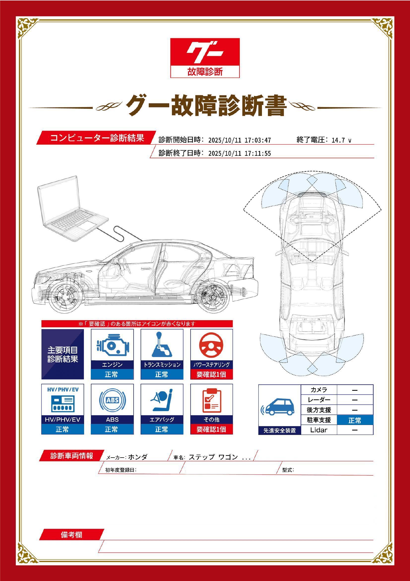 保証項目 3ヶ月・3000km以内ならエンジン、トランスミッション、ハイブリッド、ステアリング、ブレーキの各機構における主要項目を無償修理(または交換)いたします。
