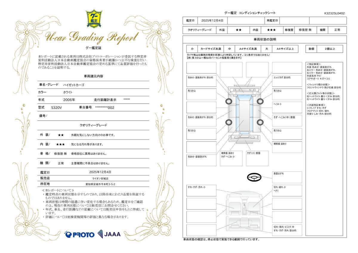 • また、修復歴・法定整備・保証の有無ならびに詳細内容につきましても、必ず各販売店にご確認いただきますようお願いいたします。