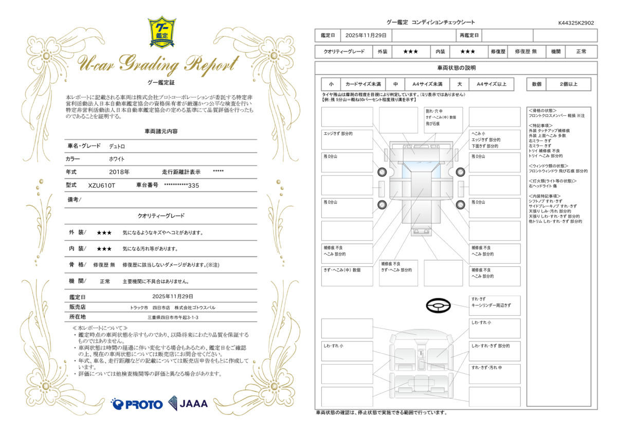 [保証付]:12ヶ月・15000km ※いずれか早い時期が保証適用の条件となります。 ■保証期間:登録日より12か月又は15,000kmの早い方 ■保証内容:エンジン機構・動力伝達機構・エアコン機構・DPF/燃料装置※詳しくは店頭にてご確認ください。 |