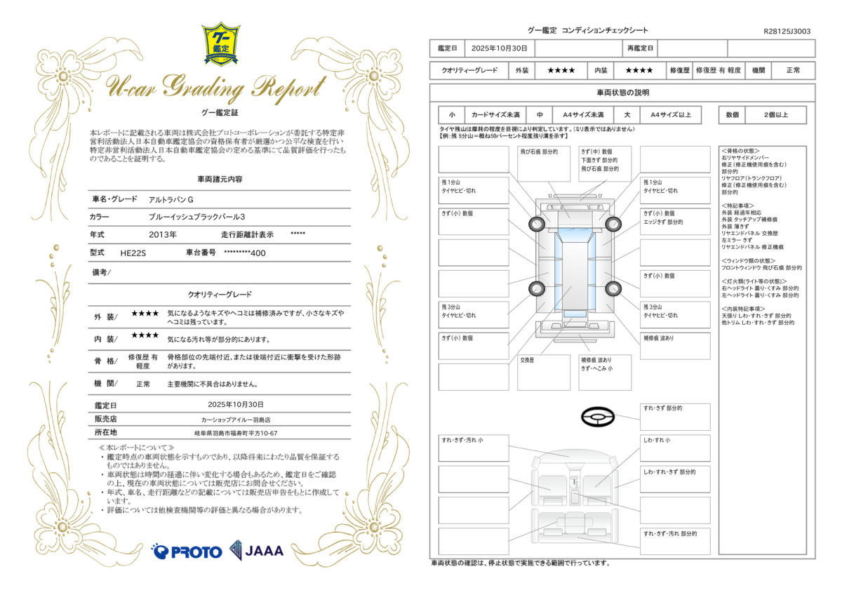 エンジン本体、ミッション本体等において重大かつ致命的な不具合、故障があった場合は保証修理いたします。年式が特に古い車両・過走行車・輸入車は内外装など、現状になりますので現車確認をお願いしております。