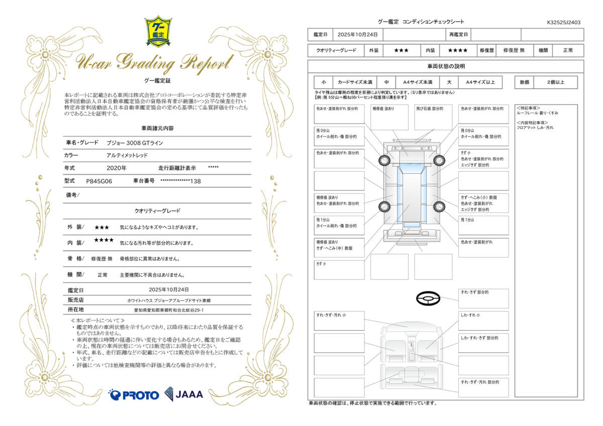 [保証付]:12ヶ月・走行無制限 1年間、走行距離制限無く、車両構成部品*に材料または製造上の問題による不具合が発生した場合、プジョー正規ディーラーにおいて無償修理することをお約束するものです。*一部対象外となる部品がございます。 |