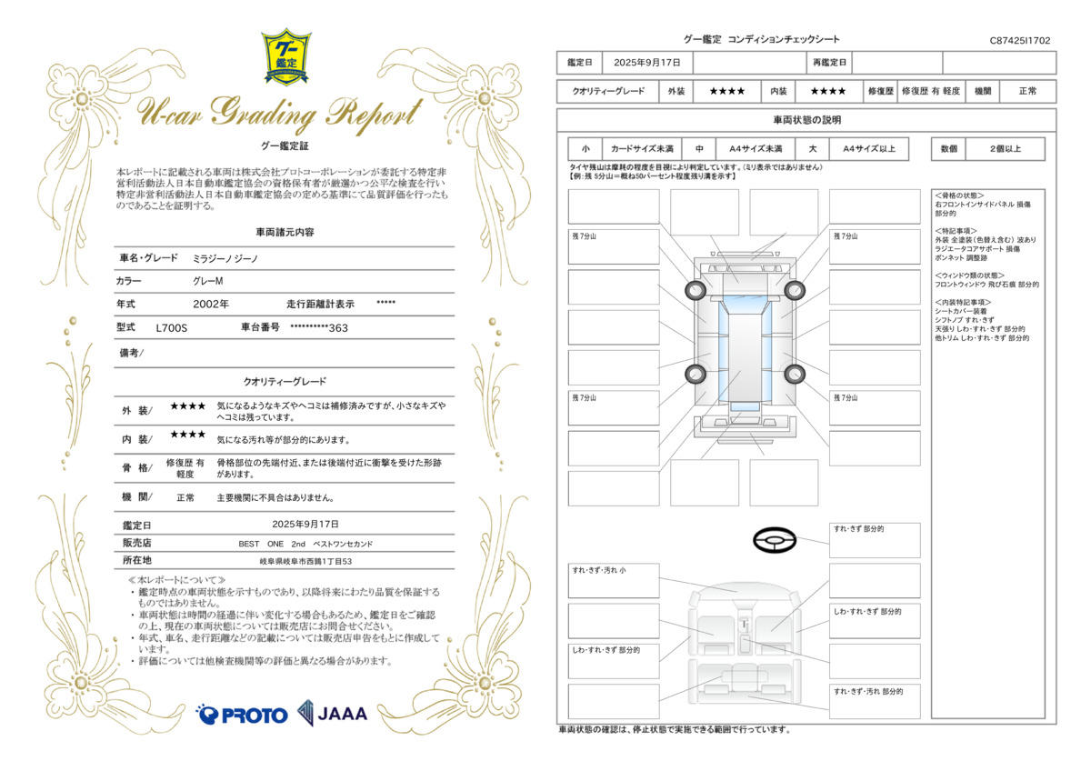 GOO鑑定済・第三者機関NPO法人JAAA鑑定評価車 ミラジーノ・グレーメタリック・5MT入庫致しました!! 1